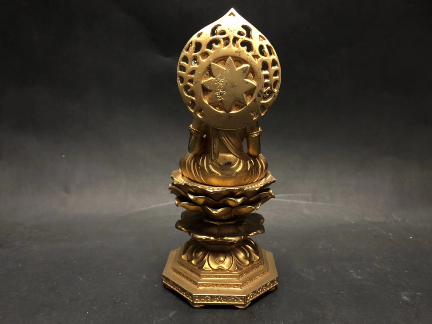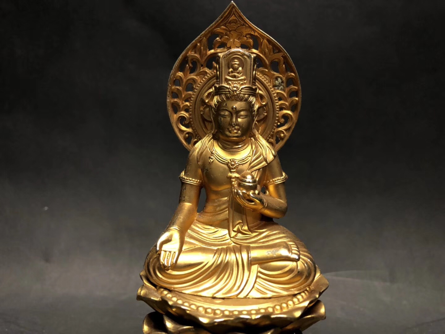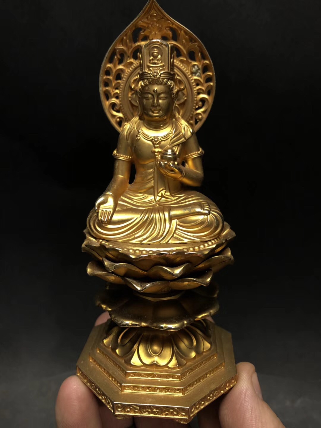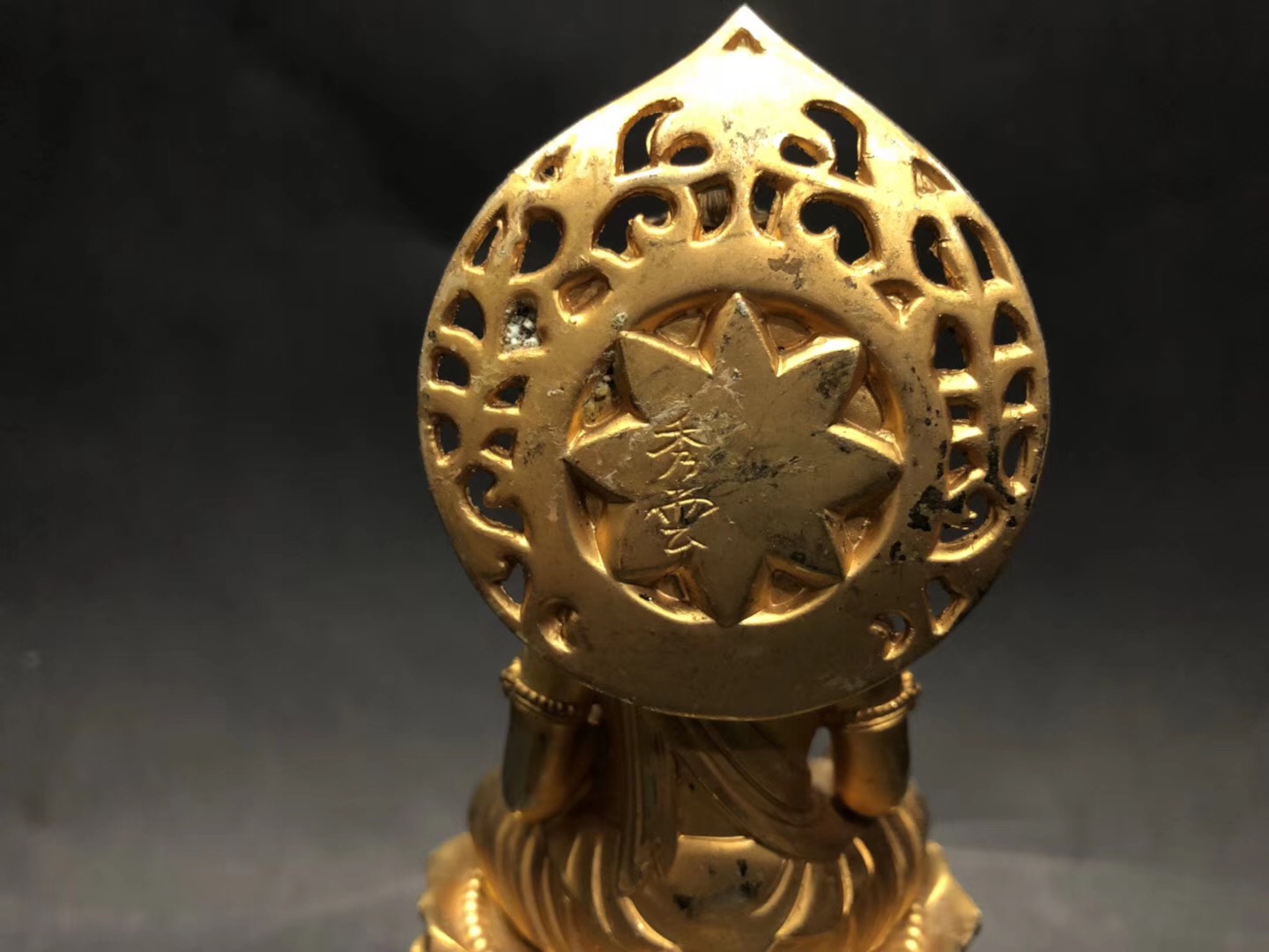 此尊佛像,体量不大,制作精细。其须弥座为六方形,上装饰覆莲瓣形。上面为仰莲瓣形三层莲花座。佛像主体似为观音菩萨,头戴宝冠,身后有椭圆形背光。后面有刻款“秀云”二字。此尊造像,铜胎镀银鎏金,制作精细,非常罕见。