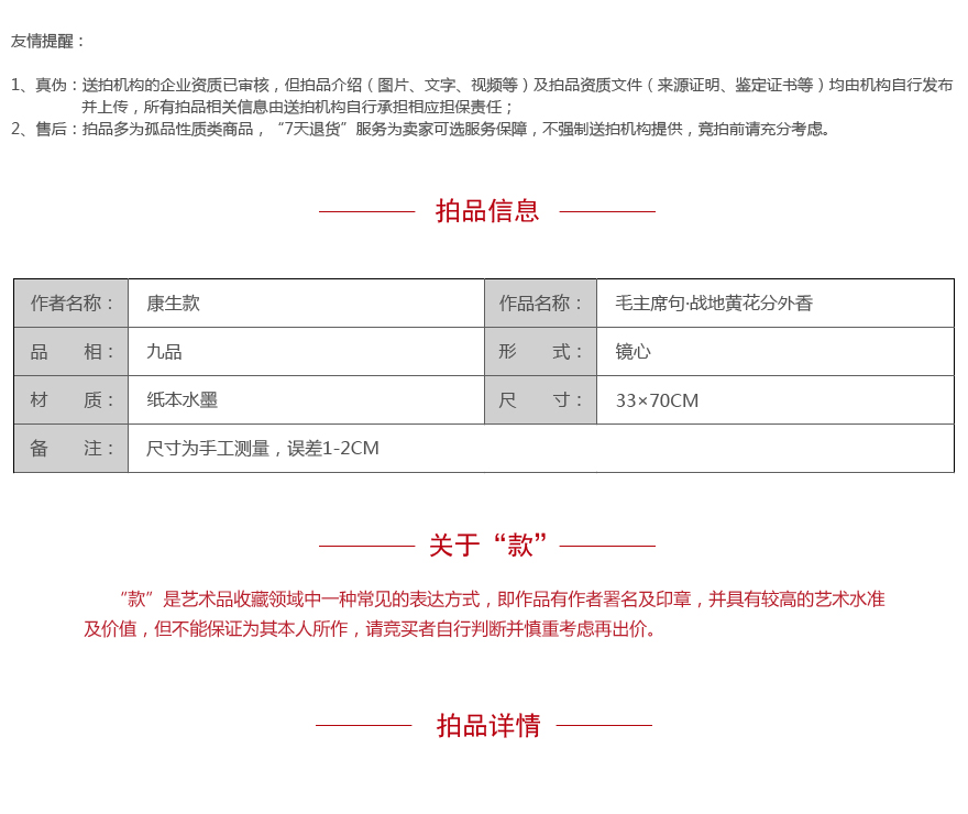 4.2 参与竞拍活动的商品由商家提供,并由商家进行配送及相应的售后服务。用户参与竞拍活动前应仔细查看竞拍活动页面对竞拍商品的信息、商品描述介绍。且知悉认可因摄影、显示等造成描述作品的色调等与原物有误差的,以原物为准。