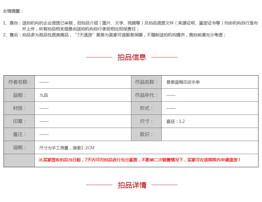 4.2 参与竞拍活动的商品由商家提供,并由商家进行配送及相应的售后服务。用户参与竞拍活动前应仔细查看竞拍活动页面对竞拍商品的信息、商品描述介绍。且知悉认可因摄影、显示等造成描述作品的色调等与原物有误差的,以原物为准。