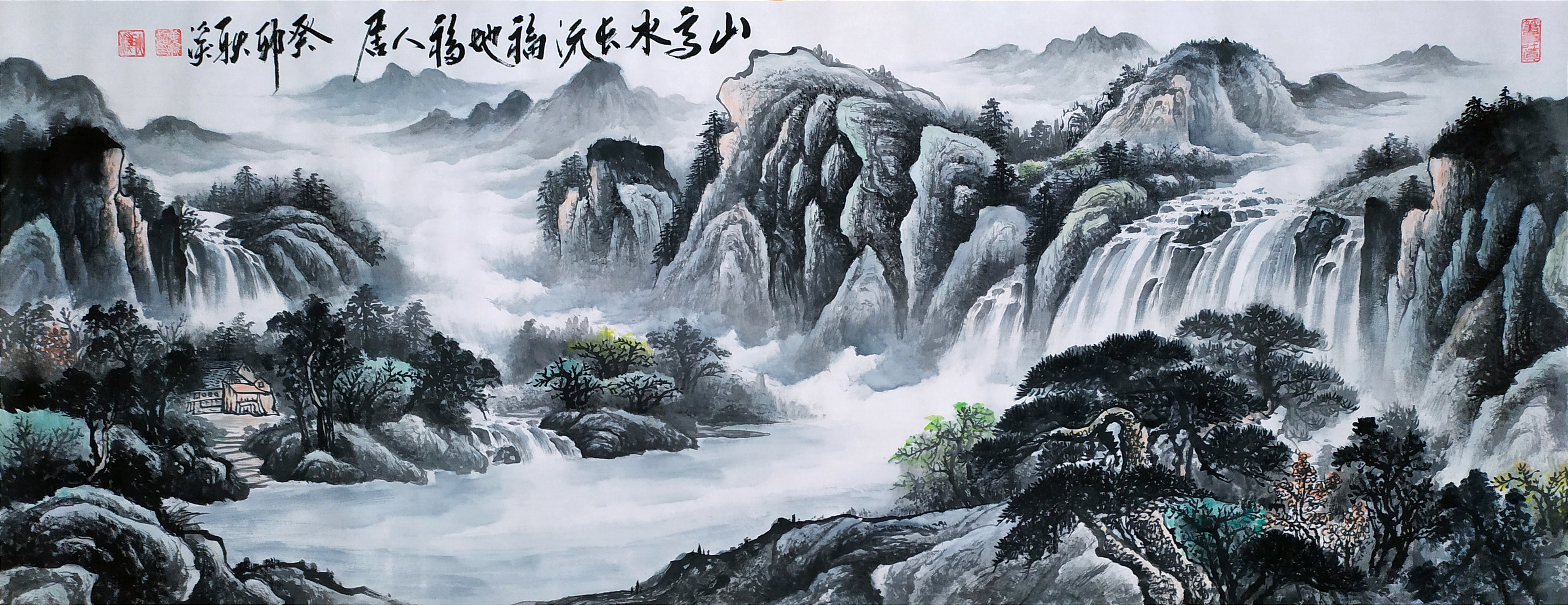 2023年作品,国画6412-180x70cm《山高流水长,福地福人居》