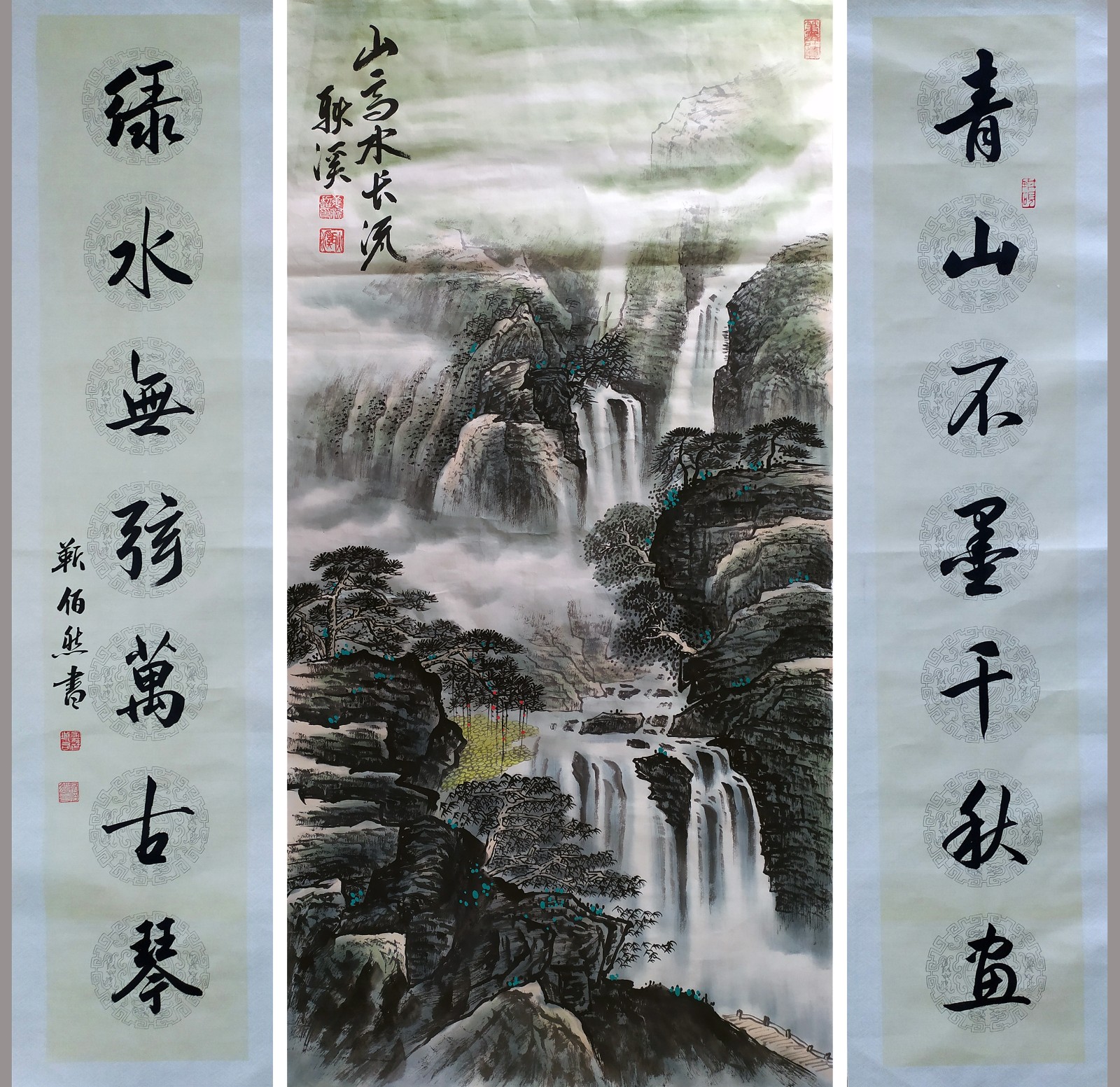 2023年作品,国画《山高水长流》130x68cm+书法对联《青山绿水》138x34cmx2