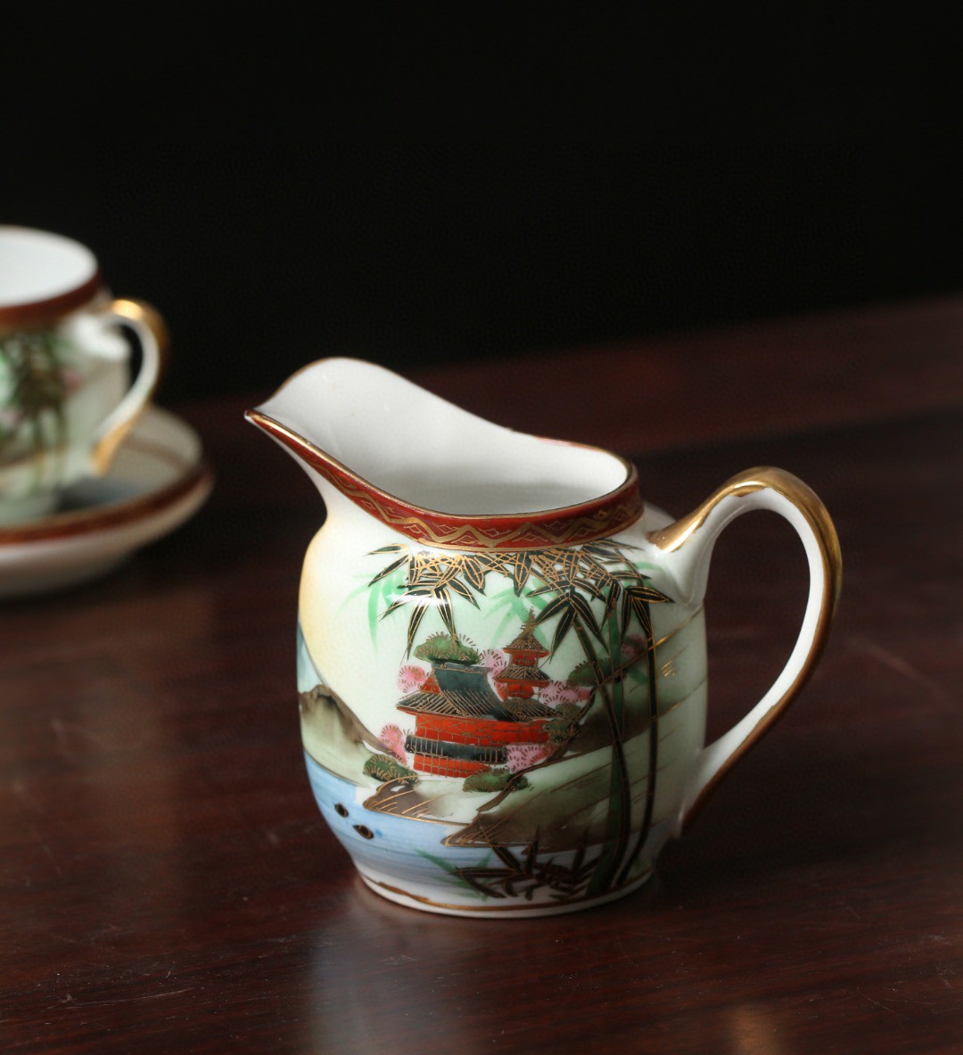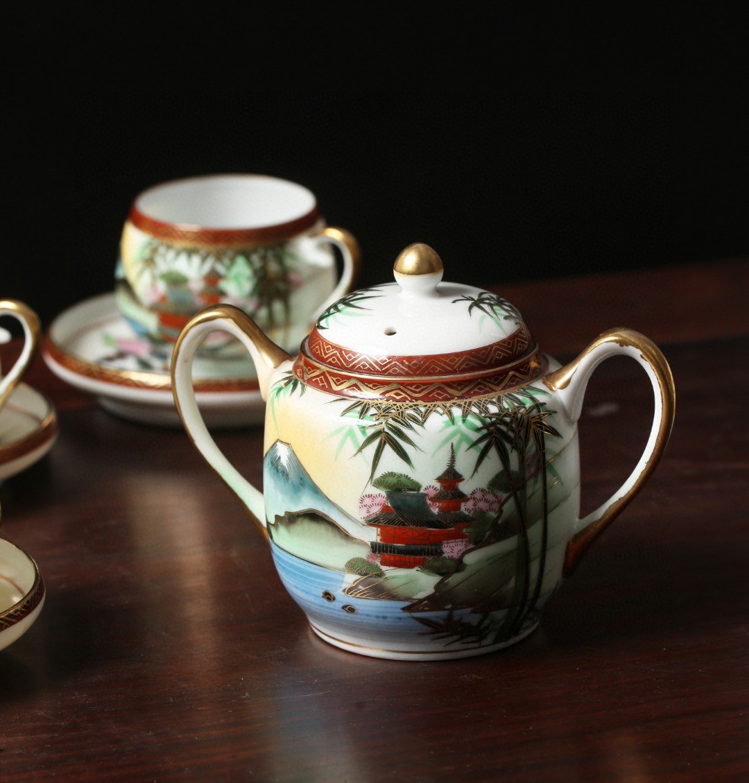 此套花茶具由杯碟、双耳壶、公道杯、茶壶组成,造型精雅,通体描金绘山水纹,纹饰精美,茶具成套而就,色彩艳而不俗,极高高雅,可谓佳品,与友人品茗之时,怎能少了美器作伴。