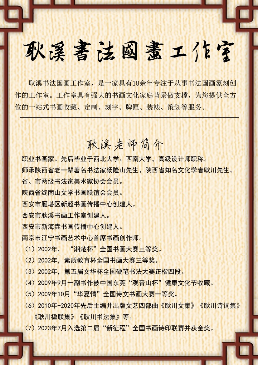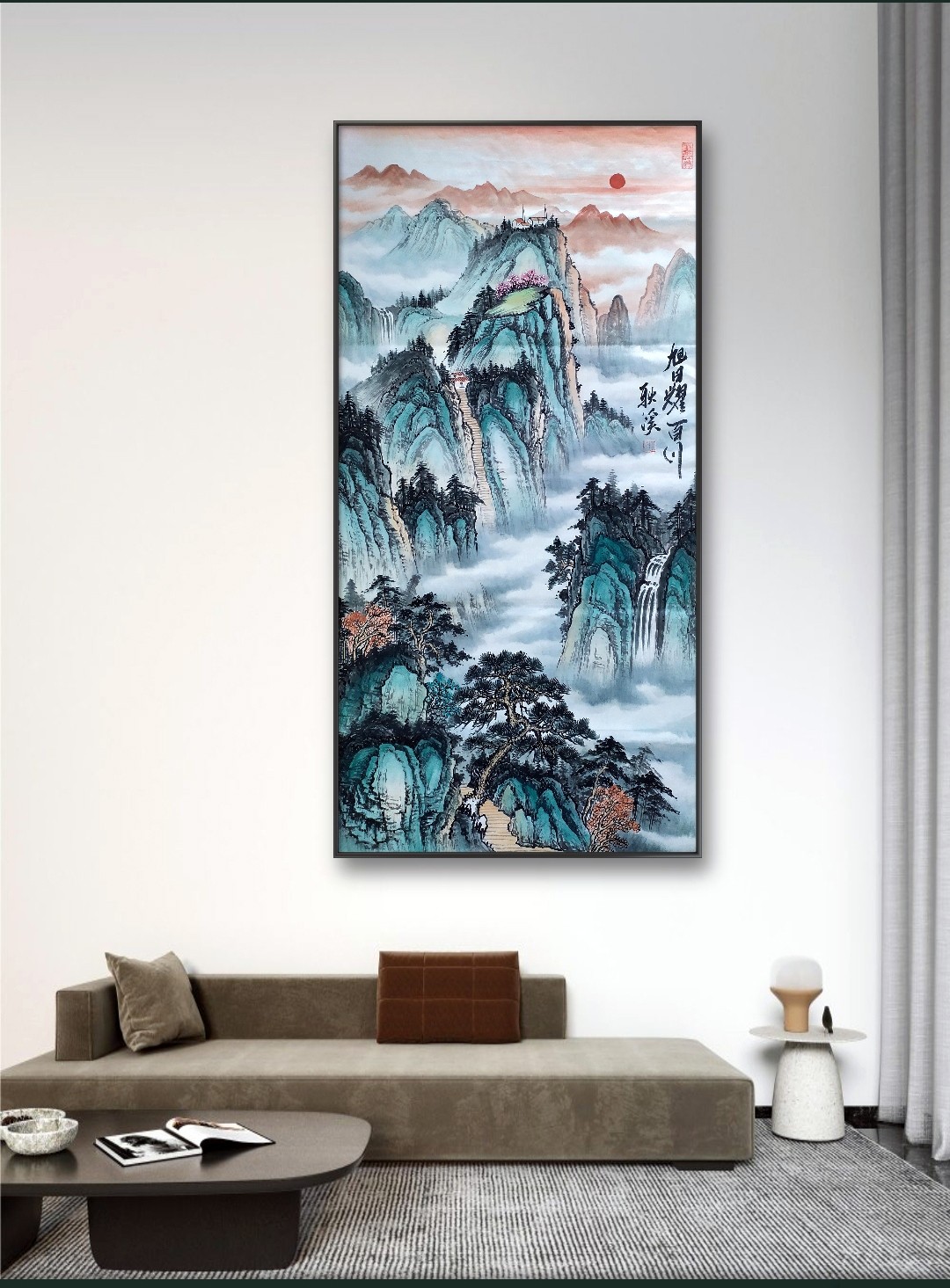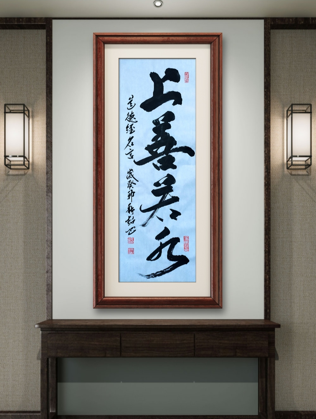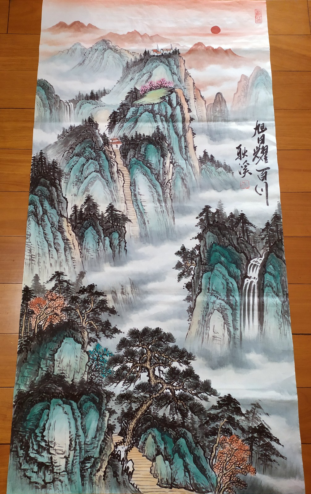 2023年作品,国画《旭日耀百川 》138x68cm+书法《道德经名句-上善若水》120x40cm