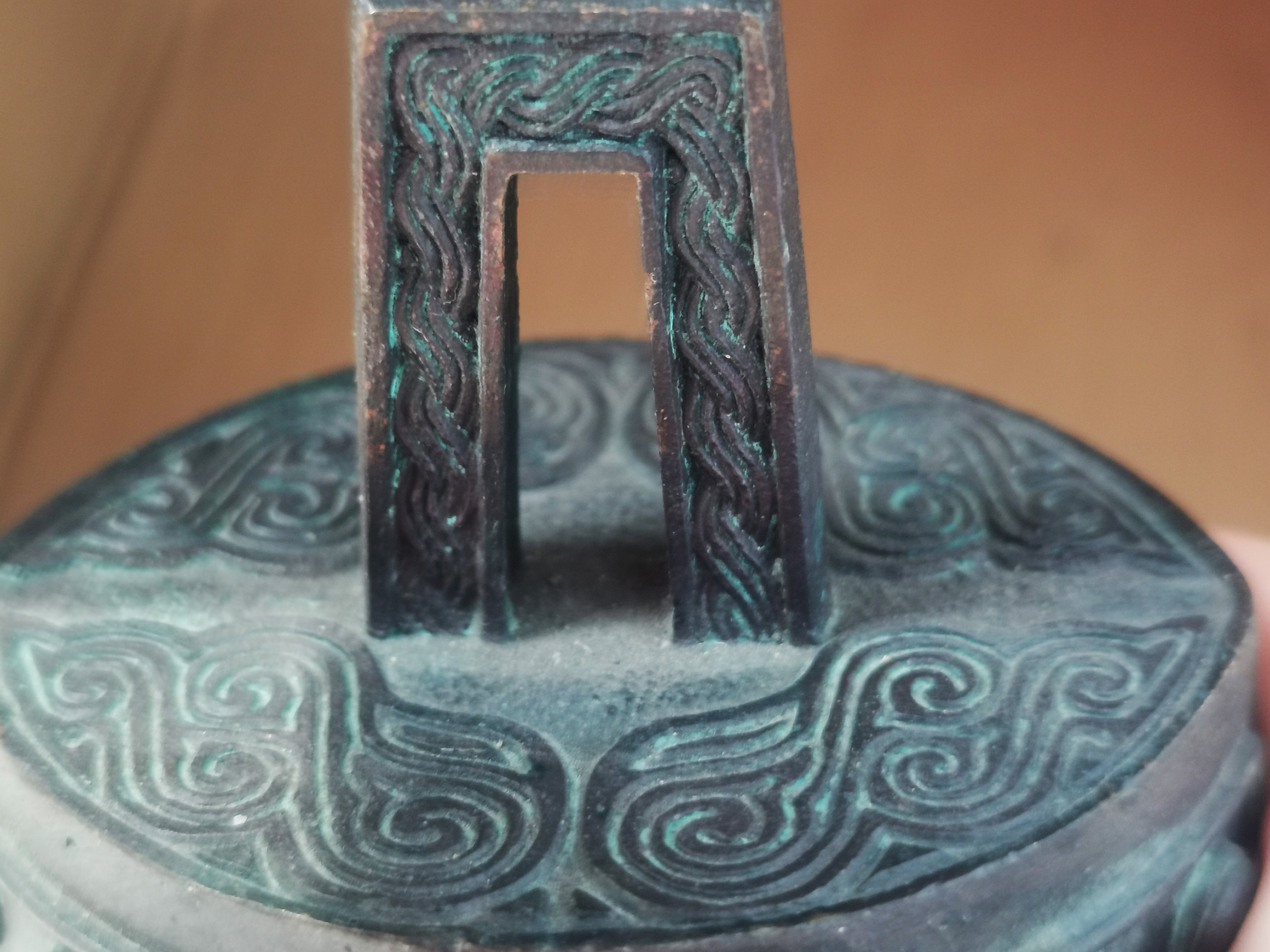 此双音钮钟以青铜而制,器型端正,呈合瓦形状,每个编钟钲部刻有鎏金篆体铭文“中华和钟”,反面钲部刻有正鼓音音铭”林钟“。周身饰满凤鸟浮雕纹饰。