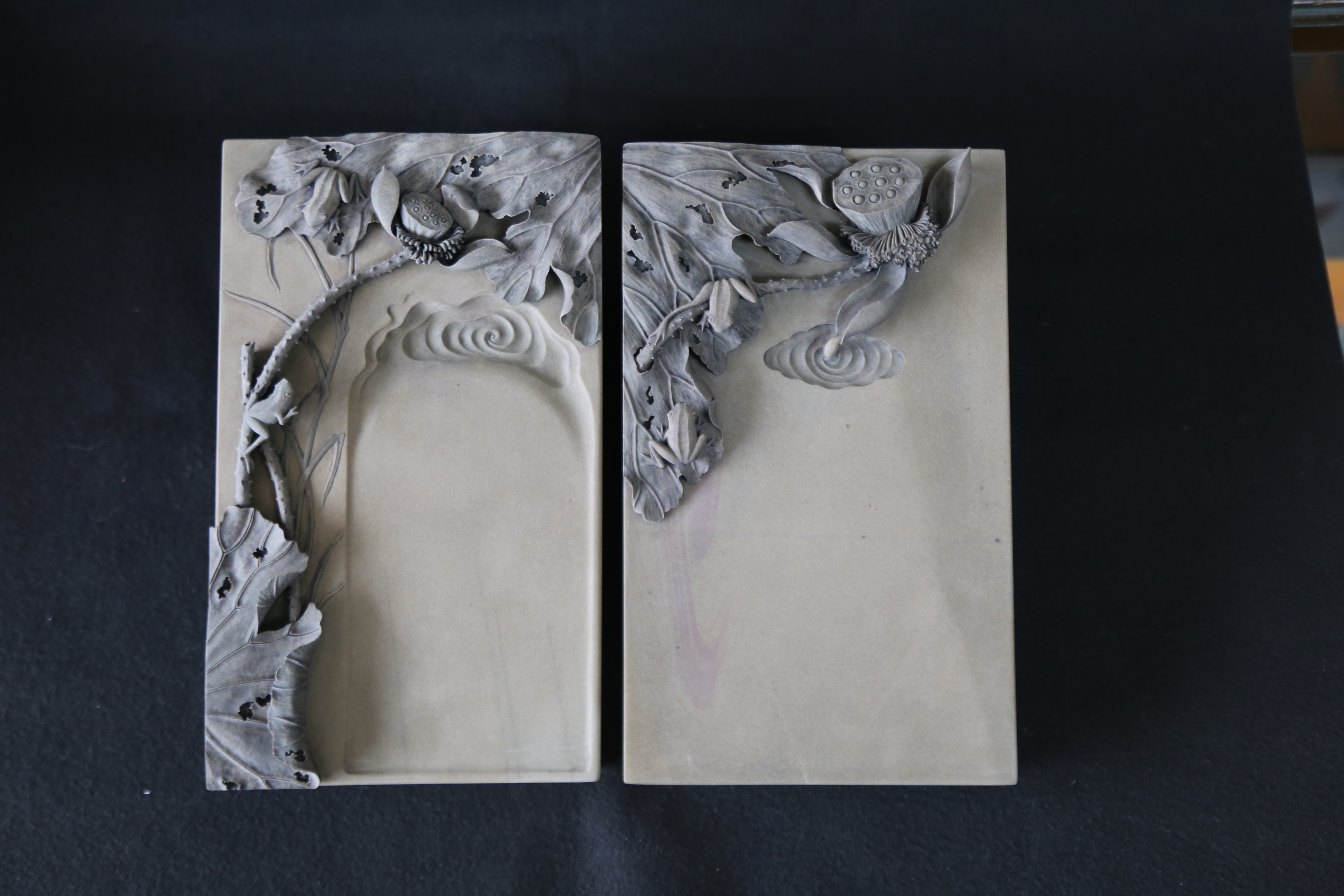 《蛙塘砚》:采用苏州灵岩山特有的沉积岩石鳝鱼黄石品雕刻,“绿塘摇滟接星津,轧轧兰桡入白苹” 通过深浅浮雕手法,构图疏密有致,动静结合的,雕刻准确细腻,出淤泥而不染,灵动的青蛙,肆意安然,自在悠闲,曾在苏州博物馆西馆展出。