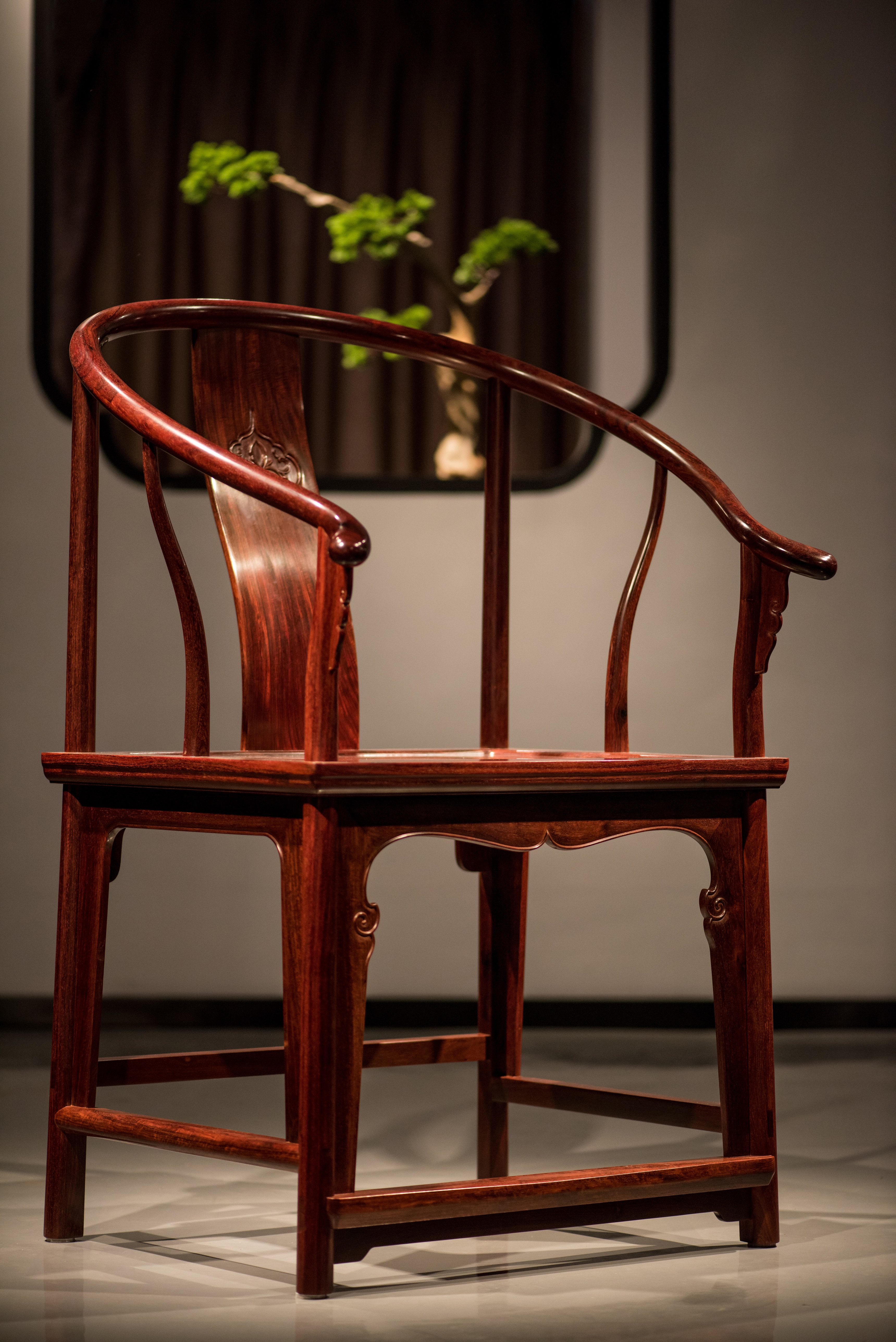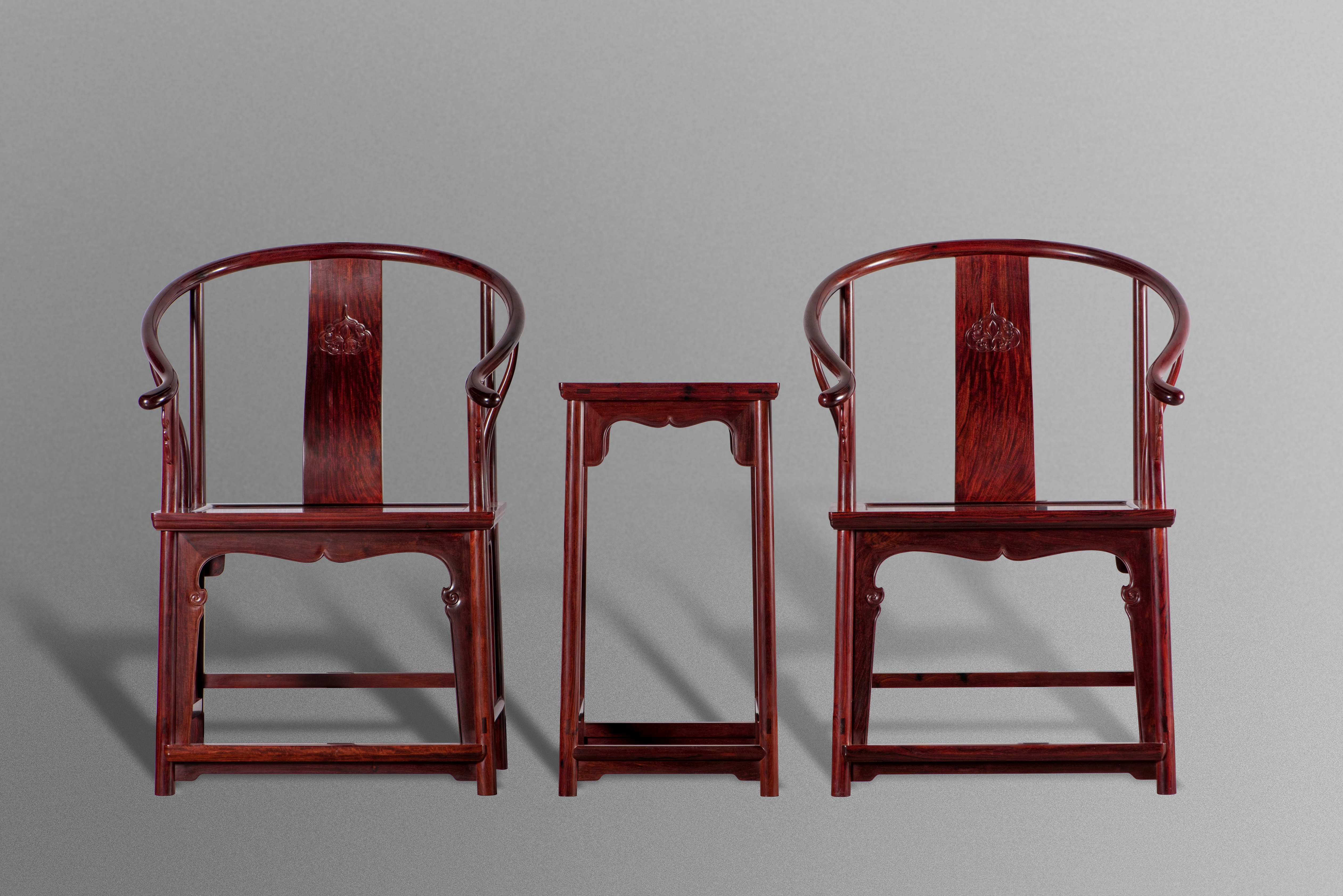 明式家具是独具中国特色的传统家具,是中国智慧的杰出代表。明式家具制作技艺在2006年准列入首批国家非物质文化遗产名录。 圈椅是明式家具中最为经典的制作。明式圈椅,造型古朴典雅,线条简洁流畅,制作技艺达到了炉火纯青的境地,“天圆地方”是中国文化中典型的宇宙观,不但建筑受其影响,也融入到了家具的设计之中。圈椅是方与圆相结合的造型,上圆下方,以圆为主旋律,圆是和谐,圆象征幸福;方是稳健,宁静致远,圈椅完美的体现了这一理念。从审美角度审视,明代圈椅造型美、线条美,与书法艺术有异曲同工之妙,又具有中国泼墨写意画的手法,抽象美产生的视觉效果很符合现代人的审美观点。圈椅的扶手与搭背形成的斜度,圈椅的弧度,座位的高度,这三度的组合,比例协调,构筑了完美的艺术想象空间。 此套明式圈椅采用名贵小叶紫檀(学名:檀香紫檀)精制而成,椅子座面板及茶几面板均为双拼面,是明式家具中的收藏佳品。