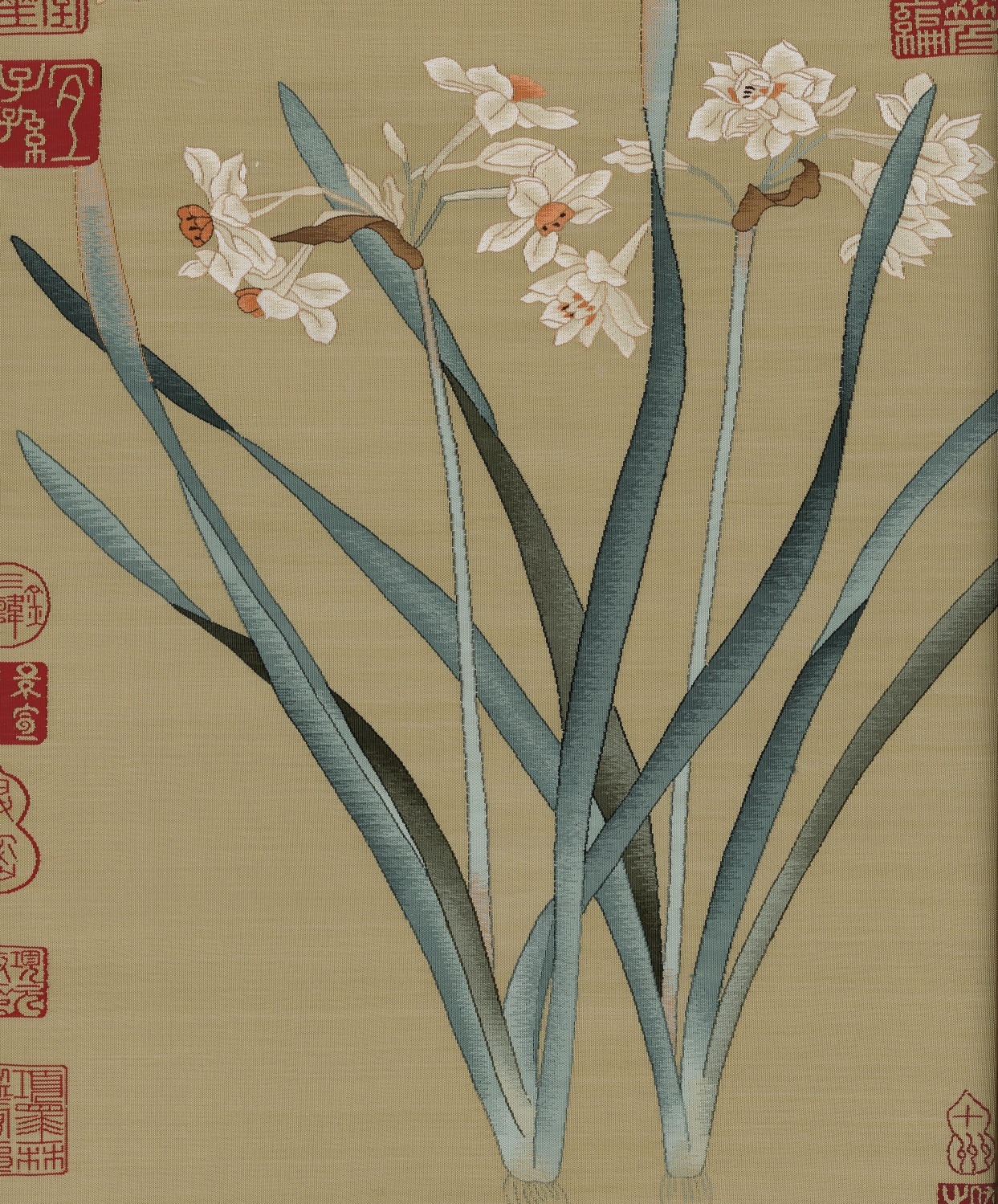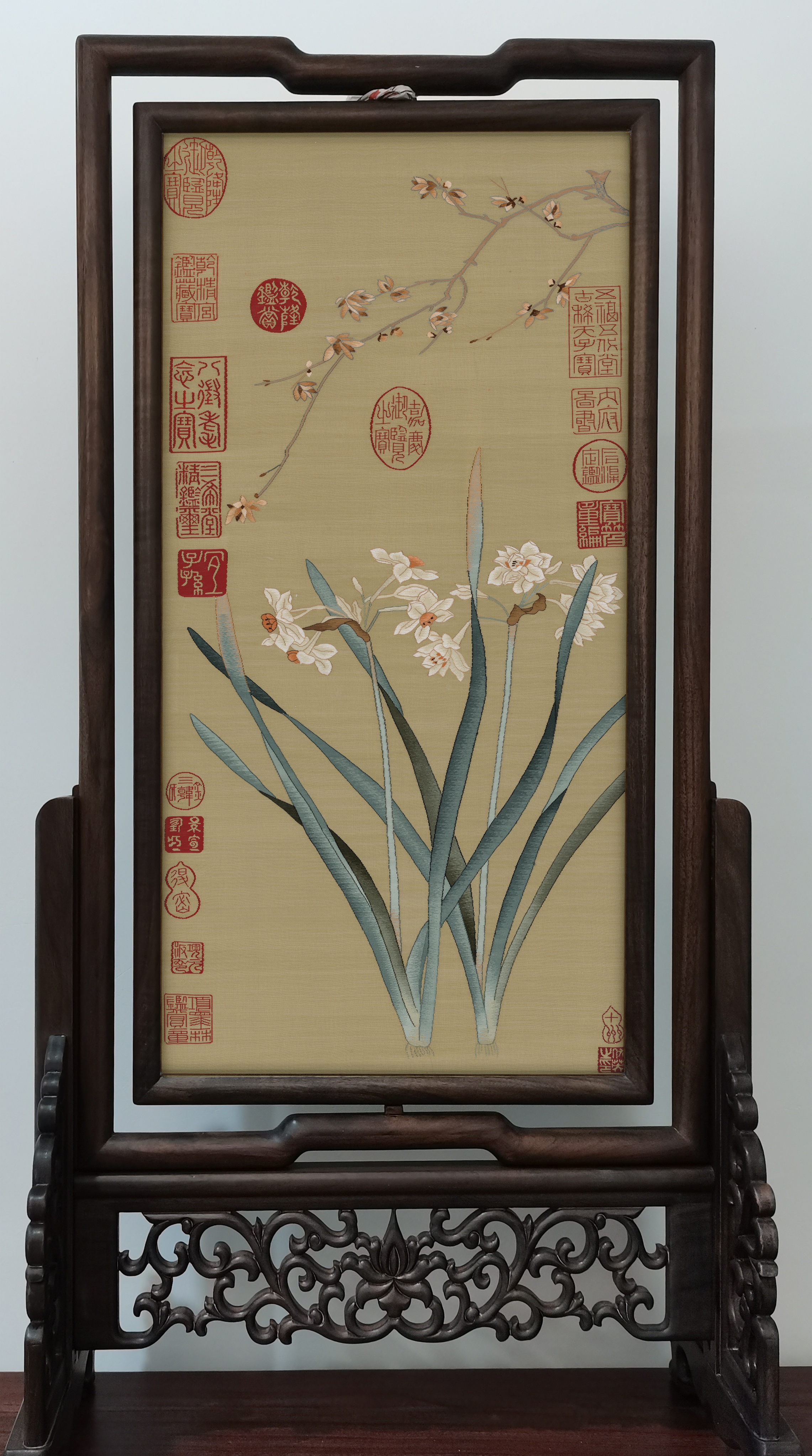 该作品根据我国明朝姑苏四大才子之仇英画《水仙腊梅图》为题材,用世界非遗缂丝技艺制作而成,其外尺寸高98厘米,宽50厘米,历时6个月完工。缂丝《水仙腊梅图》,不仅缂出了水仙的仙气,还把水仙的这种孤雅的风骨也表现的淋漓尽致,即使有腊梅相伴,仍是相得益彰,气息相投,因此就会有一种让人过目不忘的高级和雅致。画中水仙两株,叶皆转折挺立,屈曲淸趣,花开八朵,右花一正二斜一侧,左花则左右分列,且见黄蕊,虽花极类似,却在同中求变。花瓣以白色染亮处错落有致,明暗巧妙,色彩淡雅,而上面那支飘然而至的腊梅,其色彩与仙骨之美,不但不会夺了水仙的仙气,却是对同道风骨恰到好处的做了呼应。而且其色彩的应用也是雅致考究的,水仙的叶脉绿色明暗对比和谐,那几朵水仙开得甚是有灵气,娇而不媚,清新脱俗。腊梅选的是与水仙相称的素心腊梅,色彩是锗黄的明暗色,不但不会夺了水仙的灵气,反而更显得是卓尔不群,与水仙呼应有致。原作仇英的这幅《水仙腊梅图》共有两幅,这两幅都有清乾隆帝的题诗盖章,其中一幅美国弗利尔美术馆藏,另一幅台湾省台北故宫博物院藏。