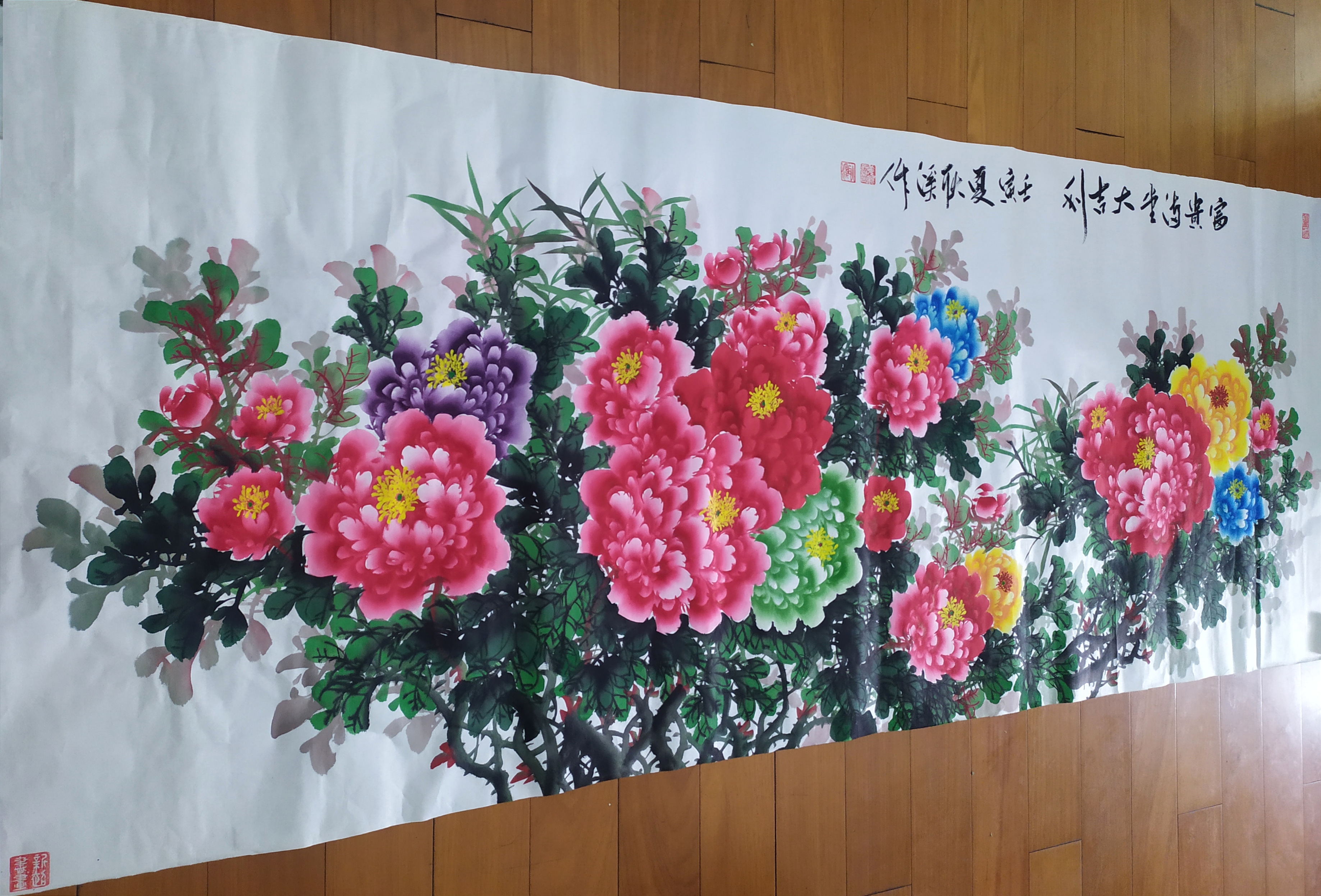 2022年作品,国画牡丹《富贵满堂大吉利》240x95cm,赠书法大字《登攀》100x60cm