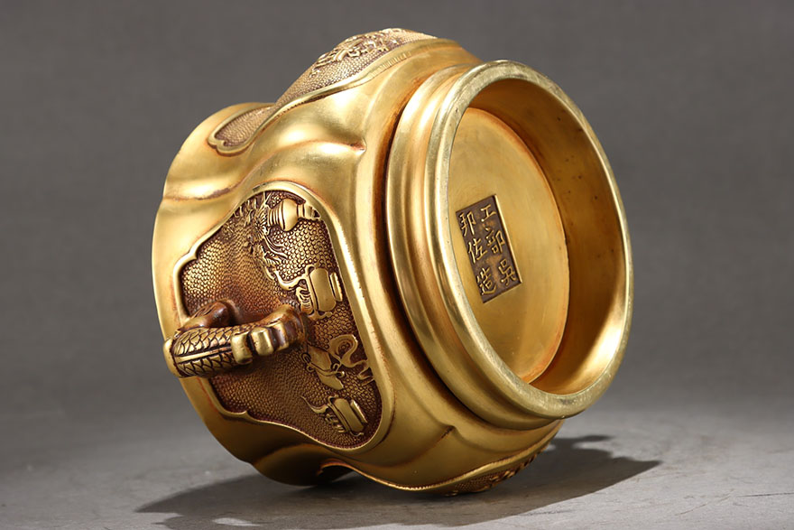 尺寸高11.9cm口径14.8cm腹径18cm耳距23cm重7.8斤 |