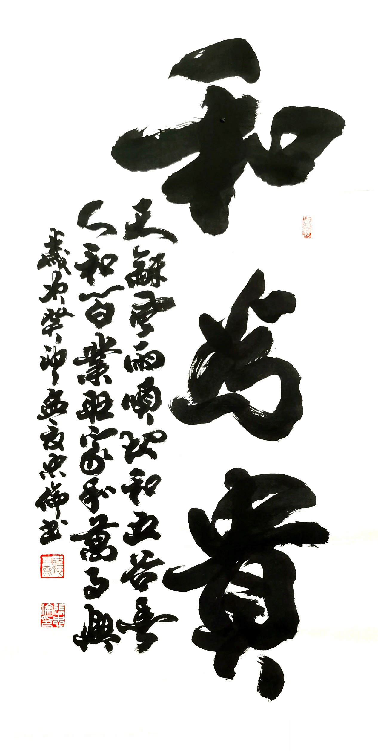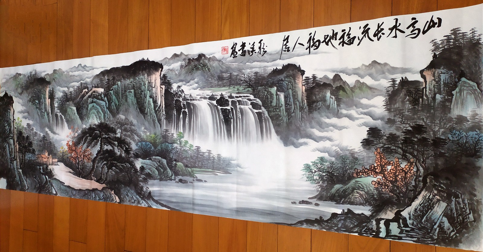 2023年作品,国画《山高水长流,福地福人居》240x70cm+书法大字《和为贵》138cmx68cm