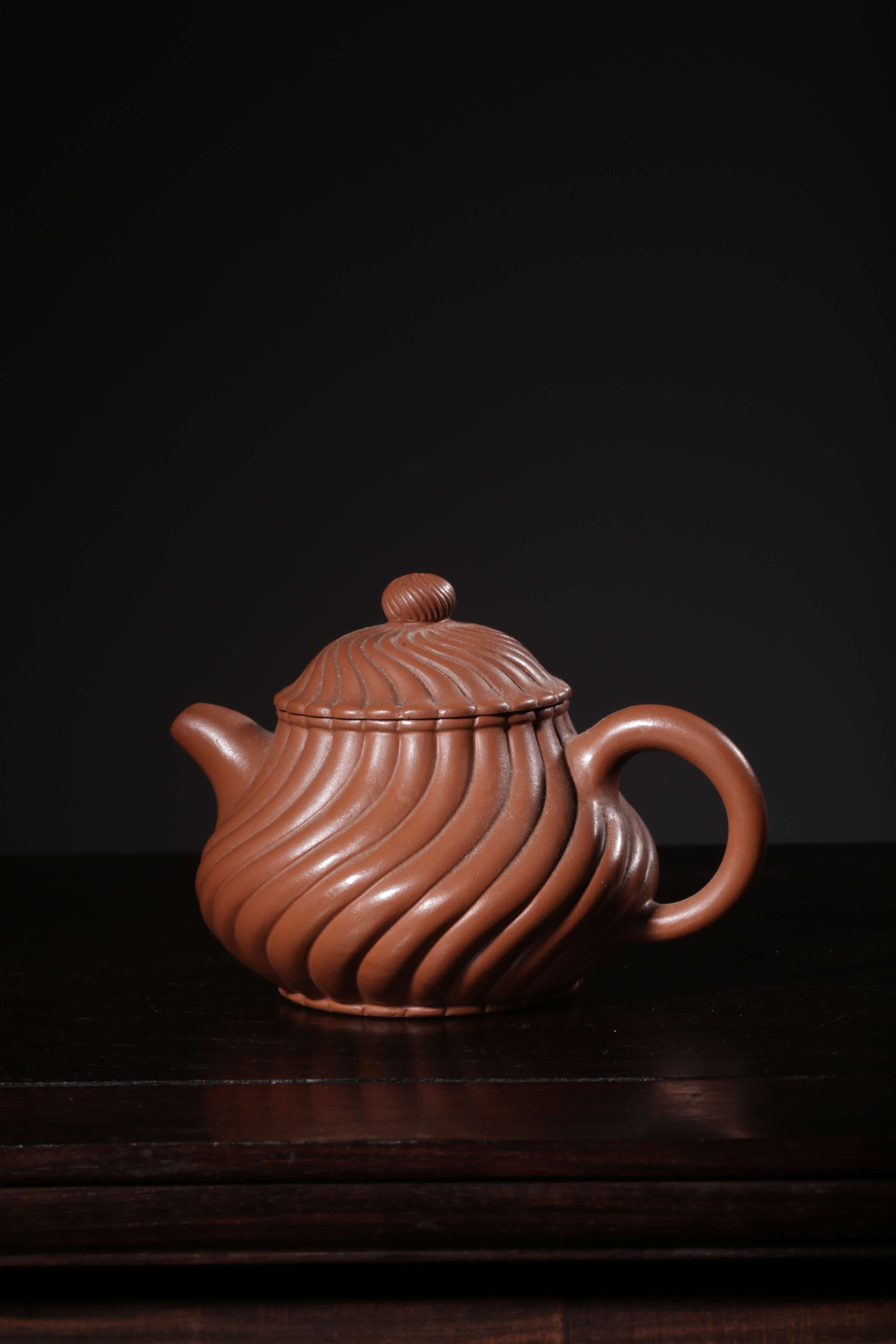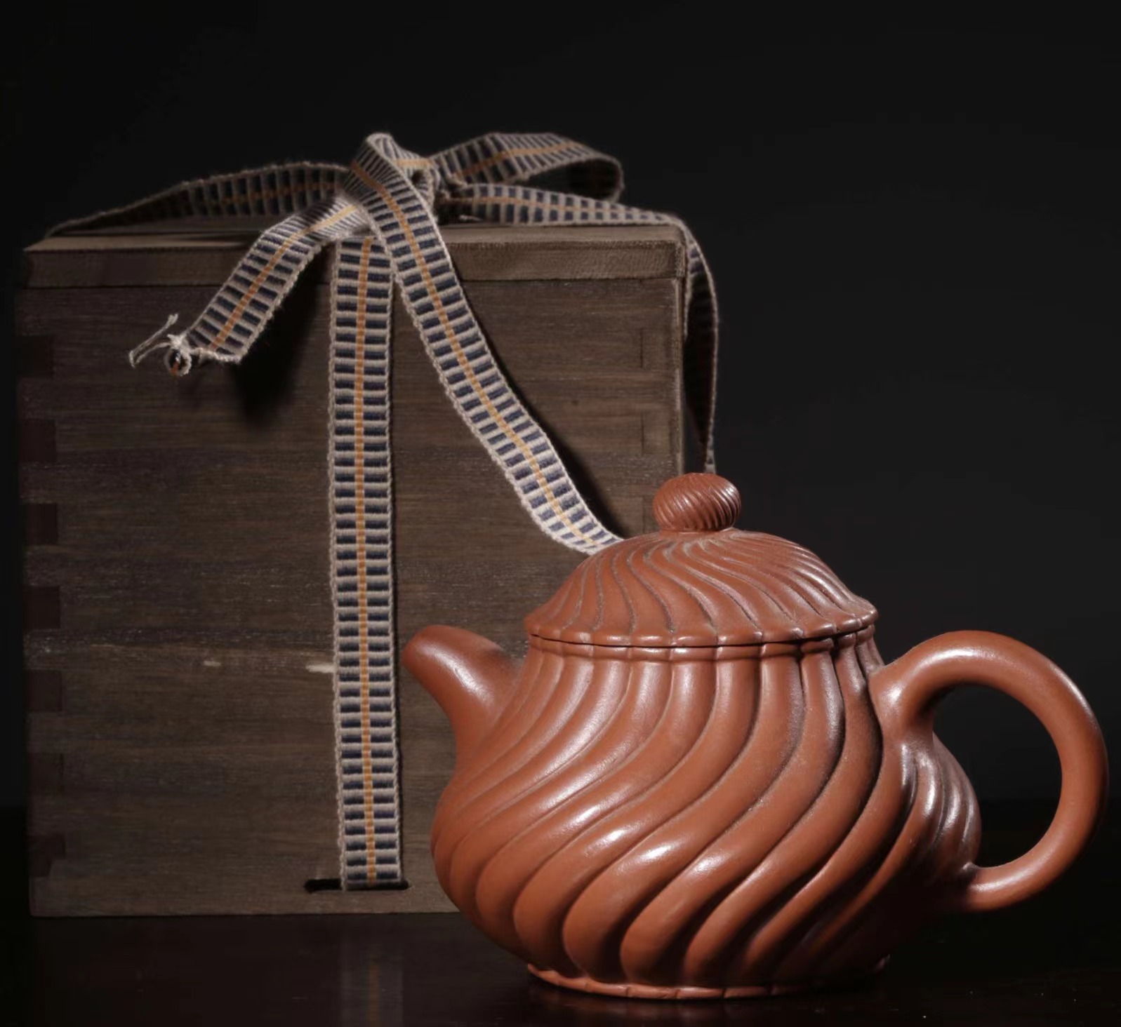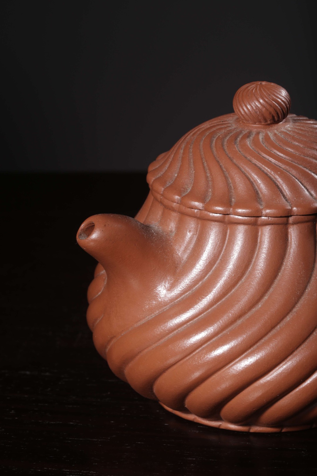 海外回流“顾景舟制”款朱泥旋纹紫砂壶