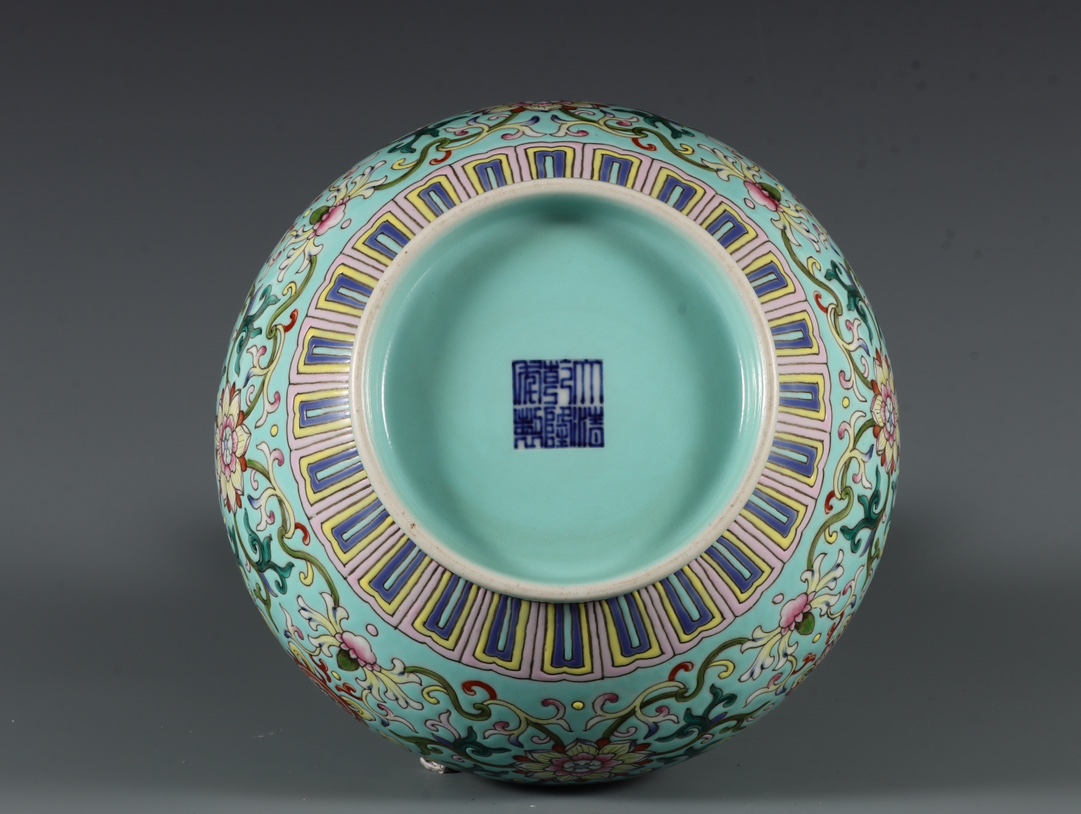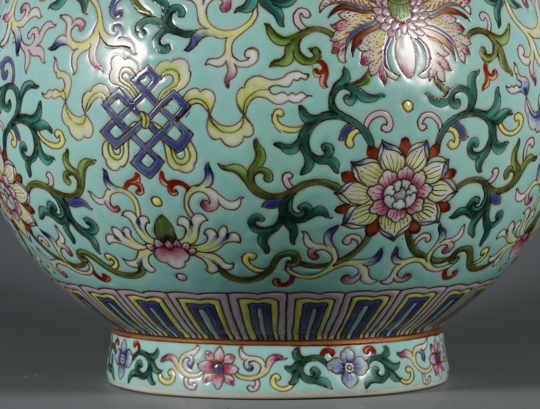 旧藏乾隆年制款松石绿地粉彩缠枝莲玉壶春瓶
