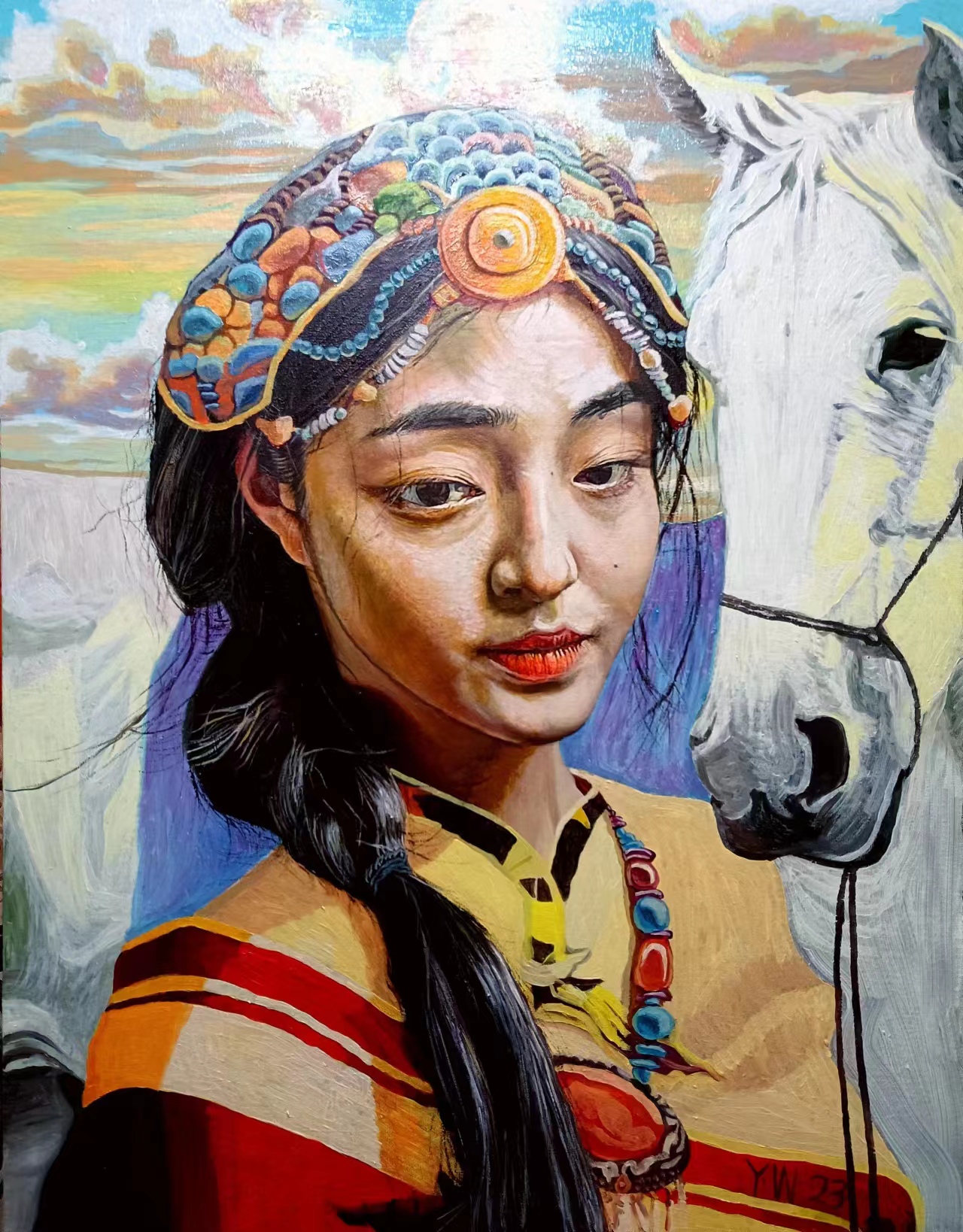 这幅作品是作者听到了一段感人的传说而作。传说央拉和多吉深爱着彼此,但是由于家族的对立与仇恨又不能在一起,俩人最后只能被迫选择了私奔。在私奔的夜晚,遇到了野狼群。多吉为了让央拉脱险,决然的留下与狼群搏斗最终寡不敌众而死。每年央拉都牵着多吉的白马搭呷布,穿着他俩结婚时的盛装,来到多吉的墓地悼念他。