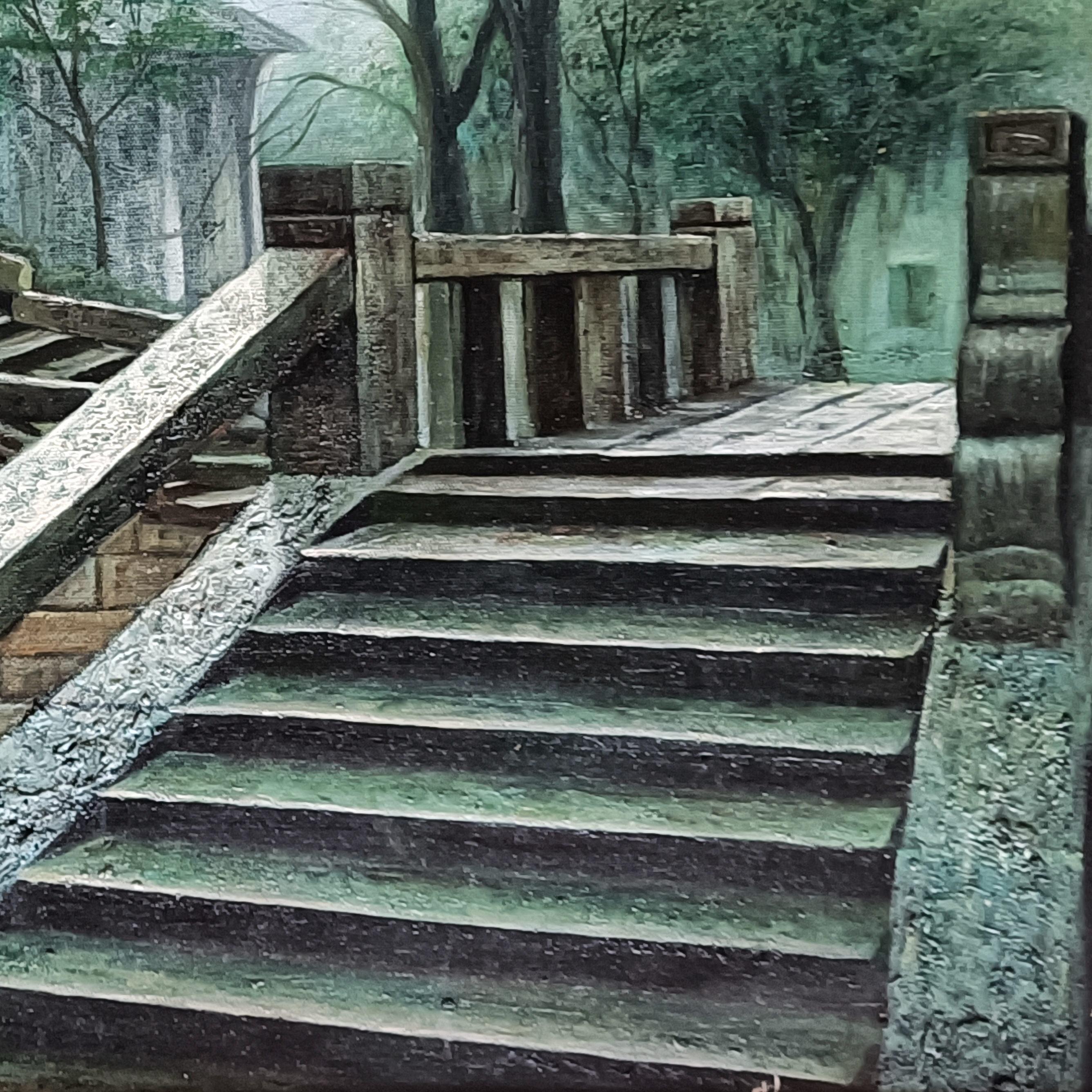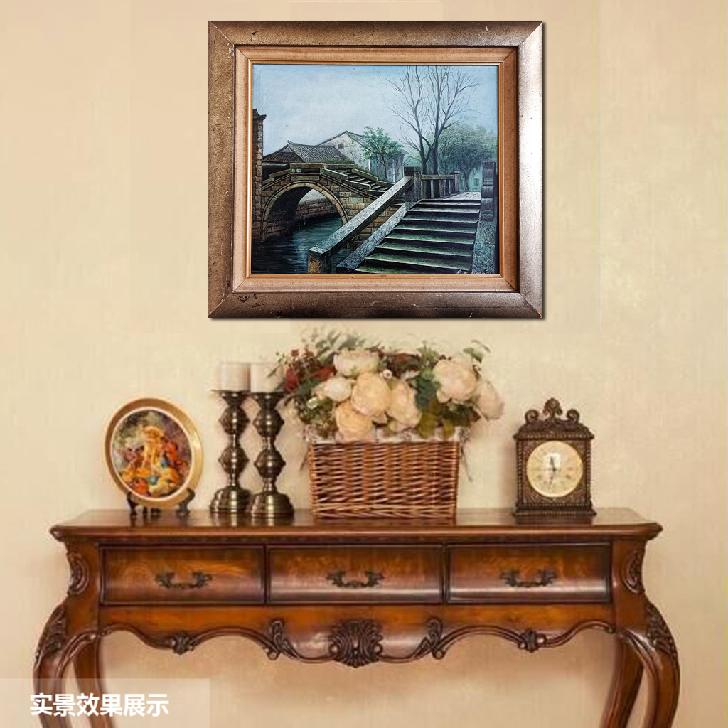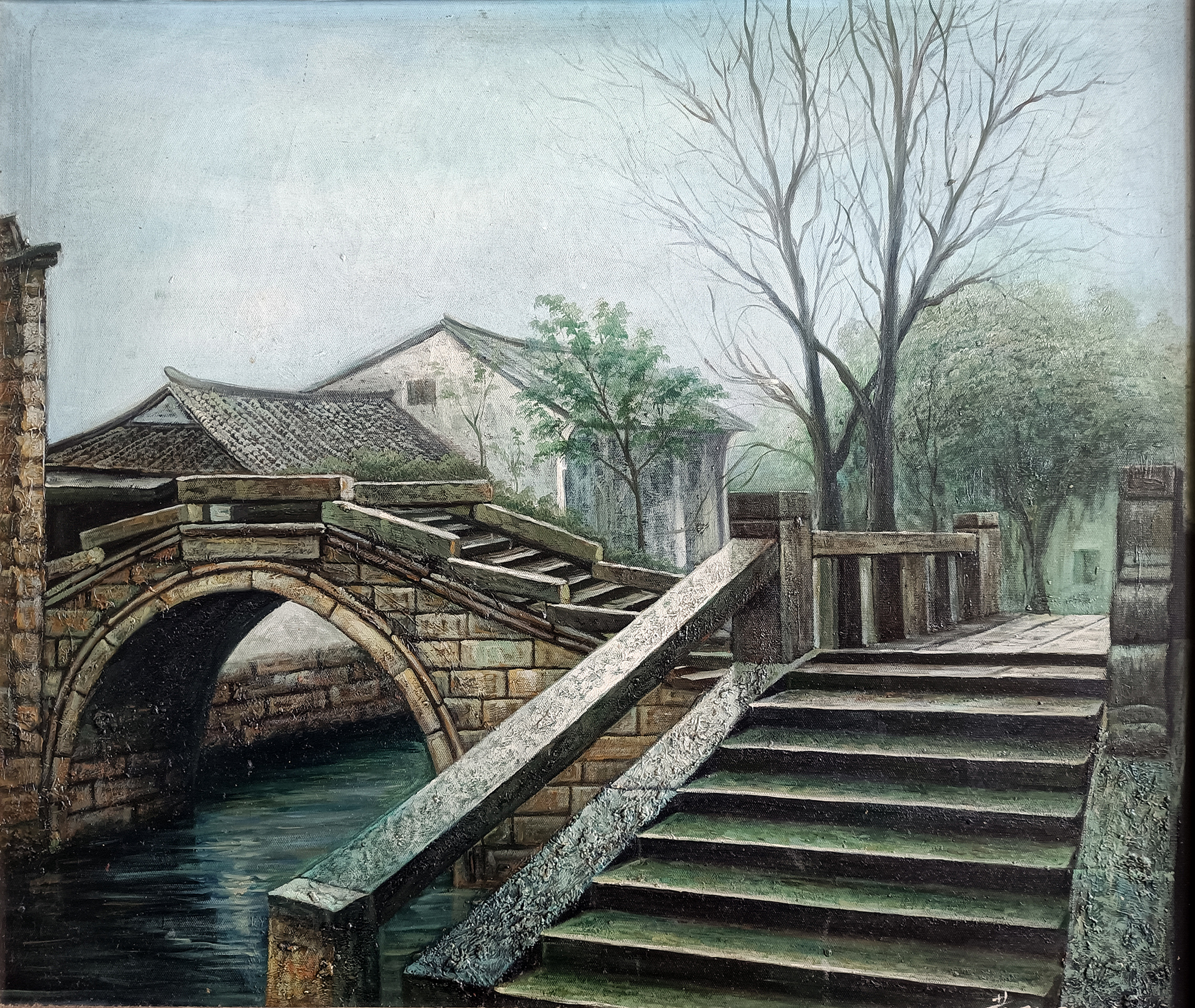 这是画家20多年前画的【周庄双桥】。周庄双桥的题材绘画很多,但是,画家的视线是把双桥整合再一起画,画家也追求风景写实油画要画出“质感”。画家画写实油画,一般总是老老实实用最原始的传统方法,按照欧洲古典油画技法,先素描、打底色、上N次油画色,最后细节化、色彩化上N次油画色完成。当然,画家绘画创作过程中会遇到挑战,有时会采用自己在绘画实践中独特的技法去解决。