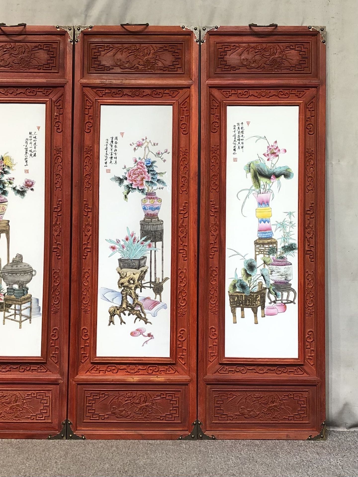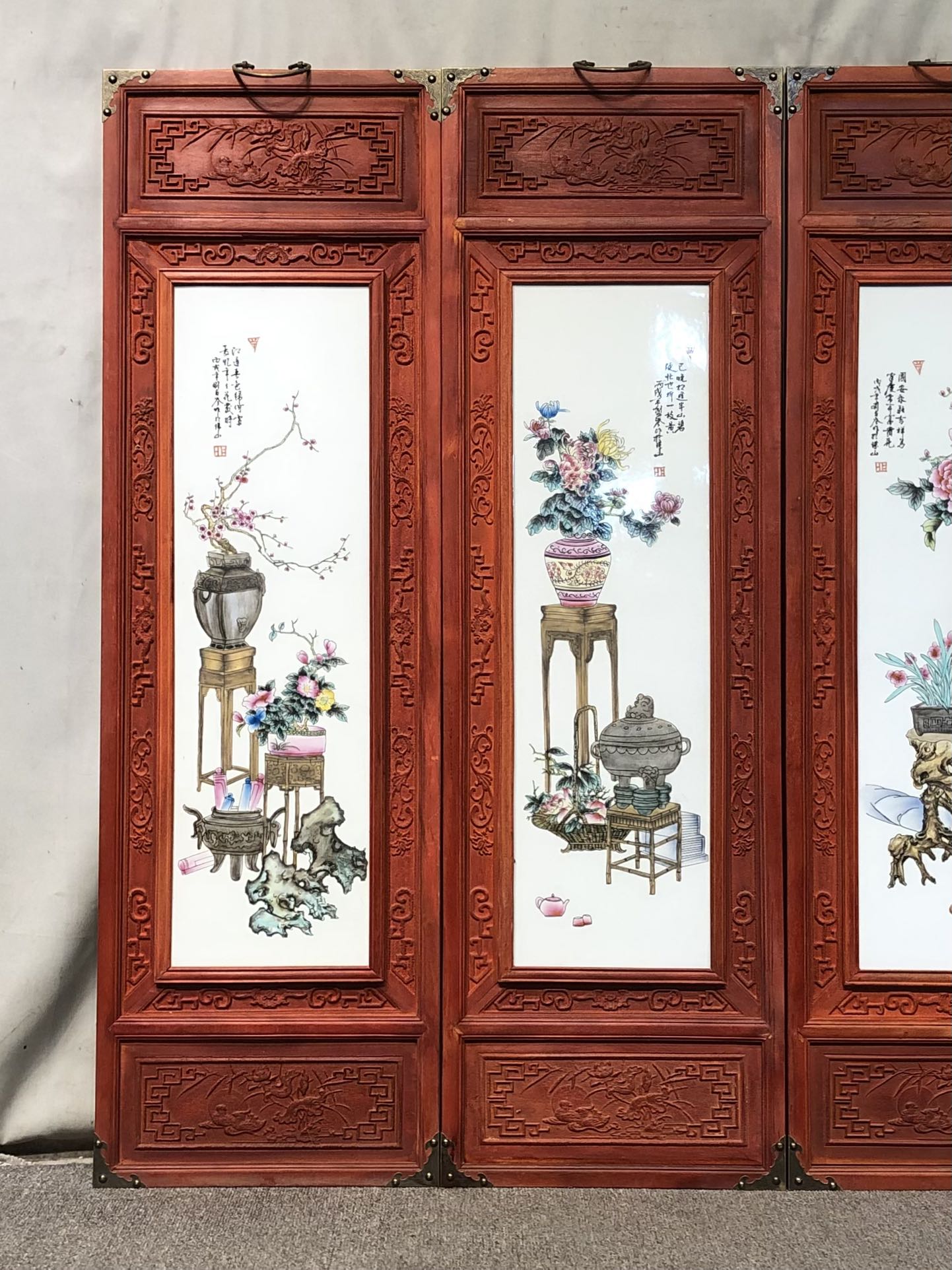 红木雕刻包铜老框镶瓷板画粉彩【博古花瓶】四条挂屏CBH025
