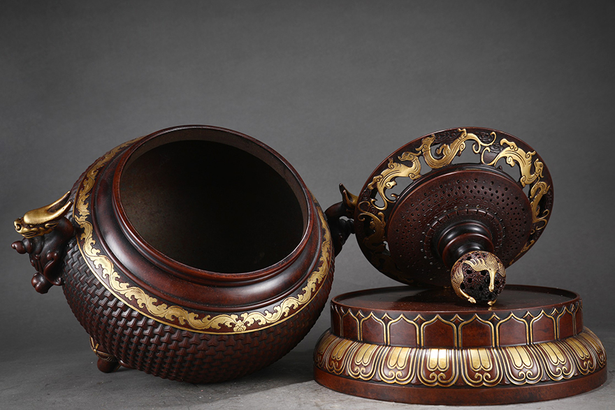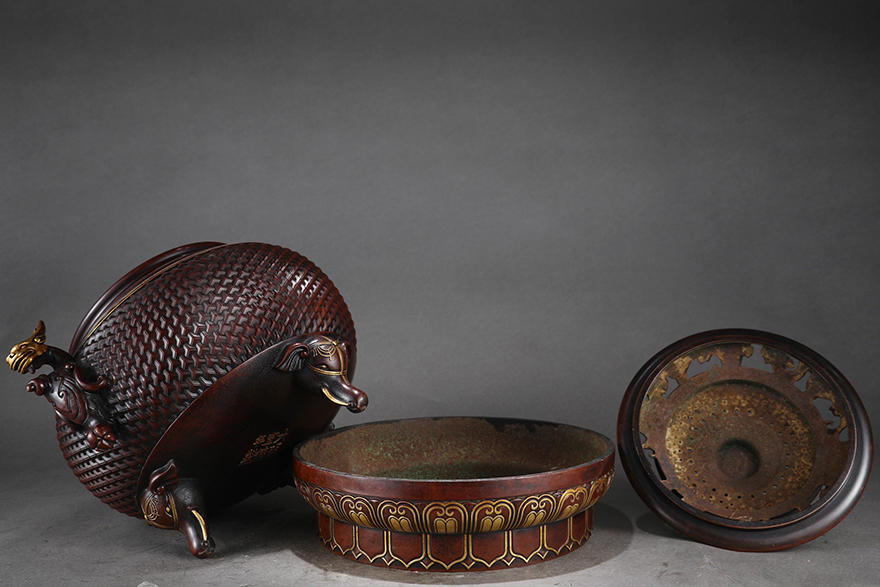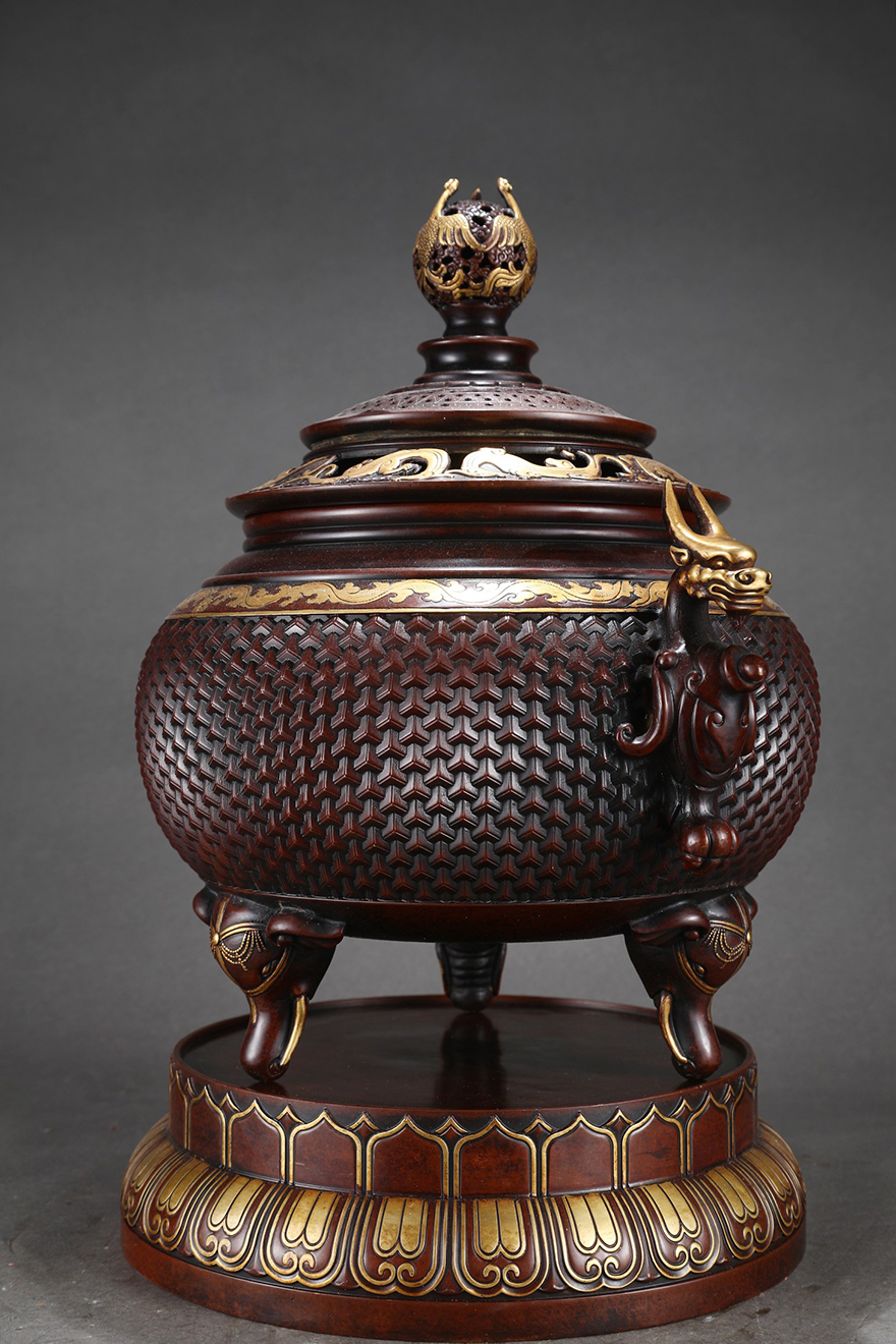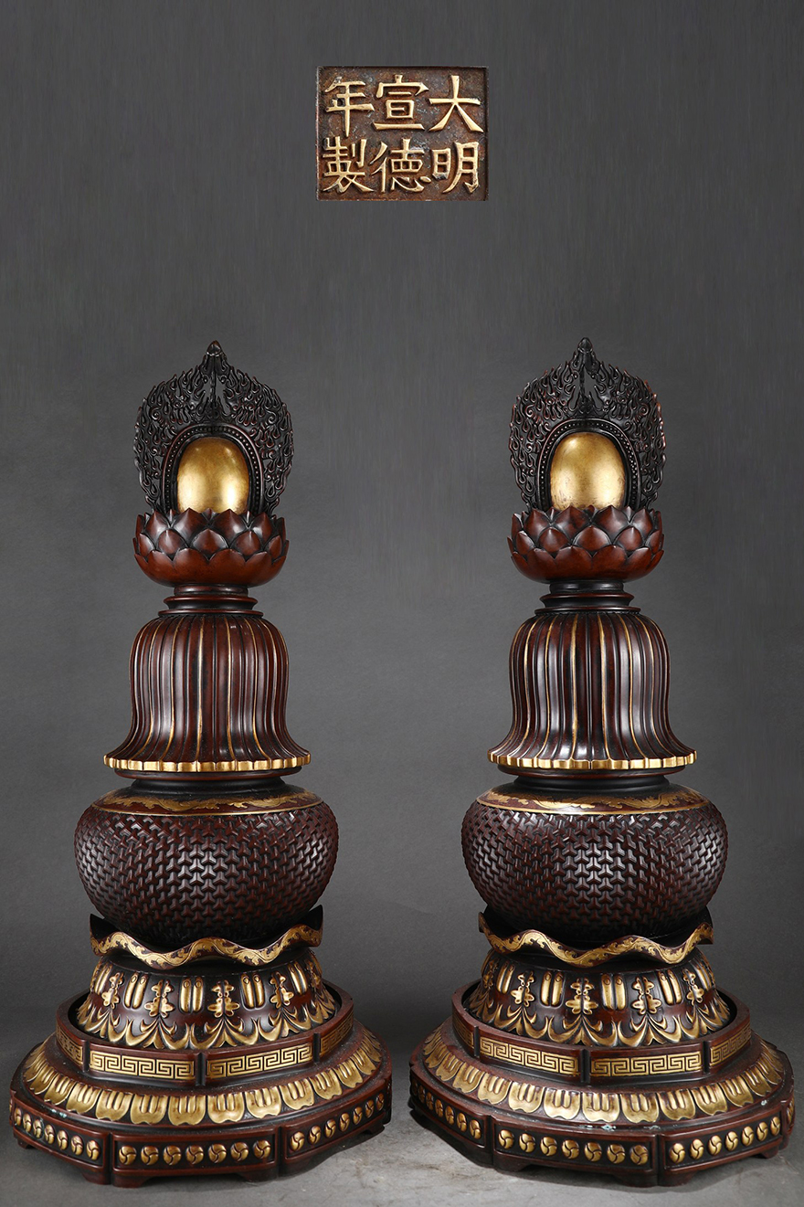 尺寸香炉:高50cm口径22.5cm腹径32cm耳距41cm重46.8斤烛台:高72cm宽34.5cm一对重135.6斤花觚:高58cm宽34.5cm一对重125.2斤 |