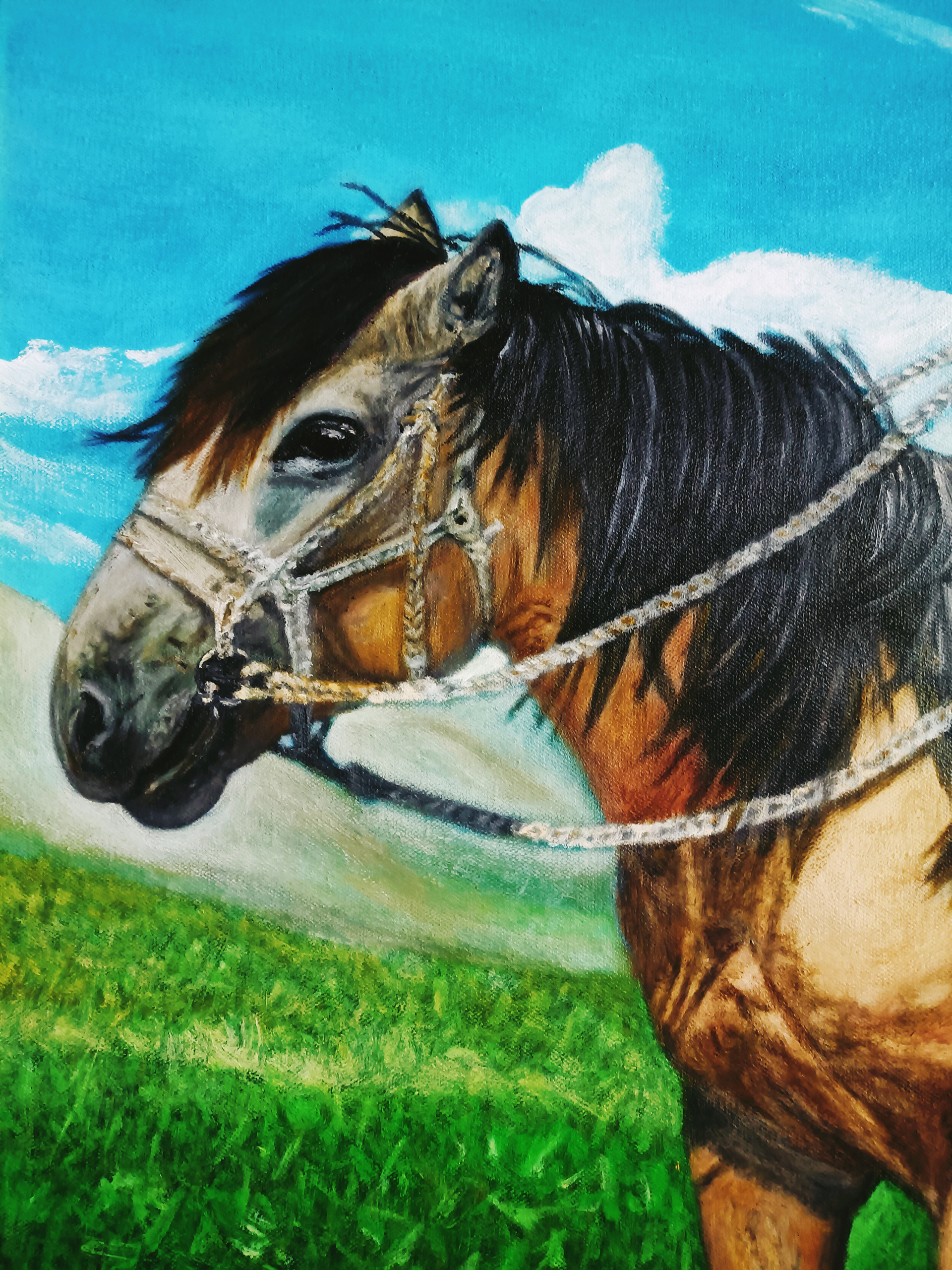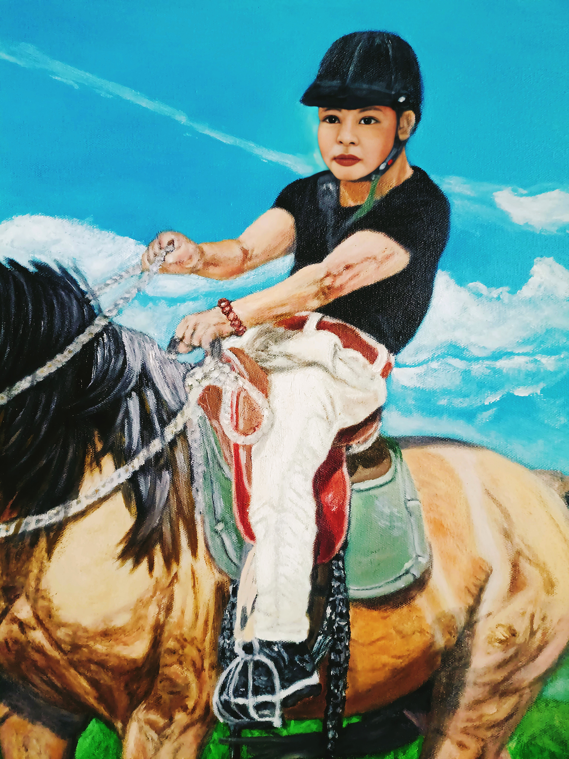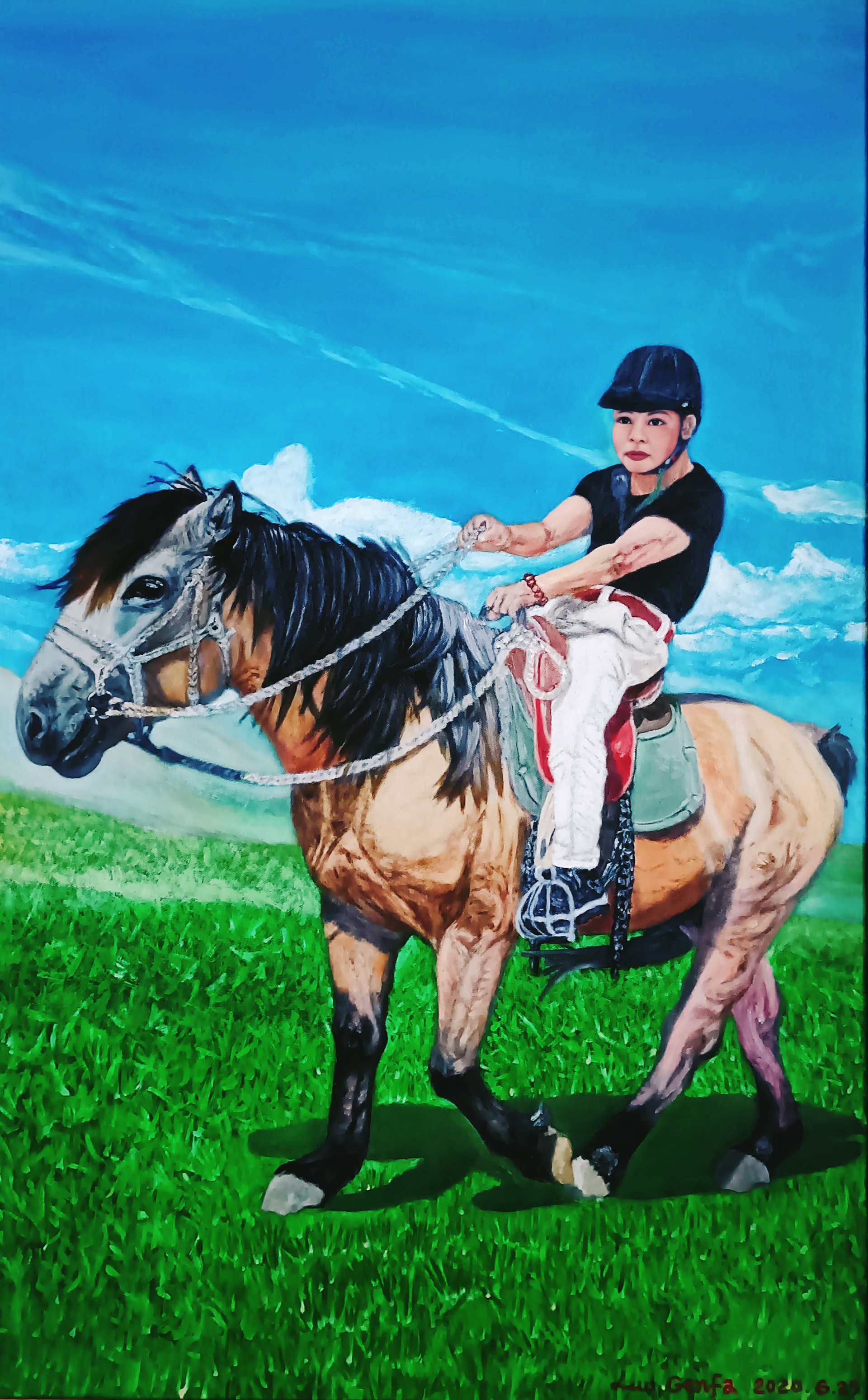 这是画家内蒙古之行,在呼伦贝尔大草原上骑蒙古马的自画像。画家追求人物肖像写实油画要展现出“血、肉、灵魂”,要画出“质感”。画家画写实油画,一般总是老老实实用最原始的传统方法,按照欧洲古典油画技法,先素描、打底色、上N次油画色,最后细节化、色彩化上N次油画色完成。当然,绘画创作过程中会遇到挑战,画家有时会采用自己在绘画实践中独特的技法去解决。