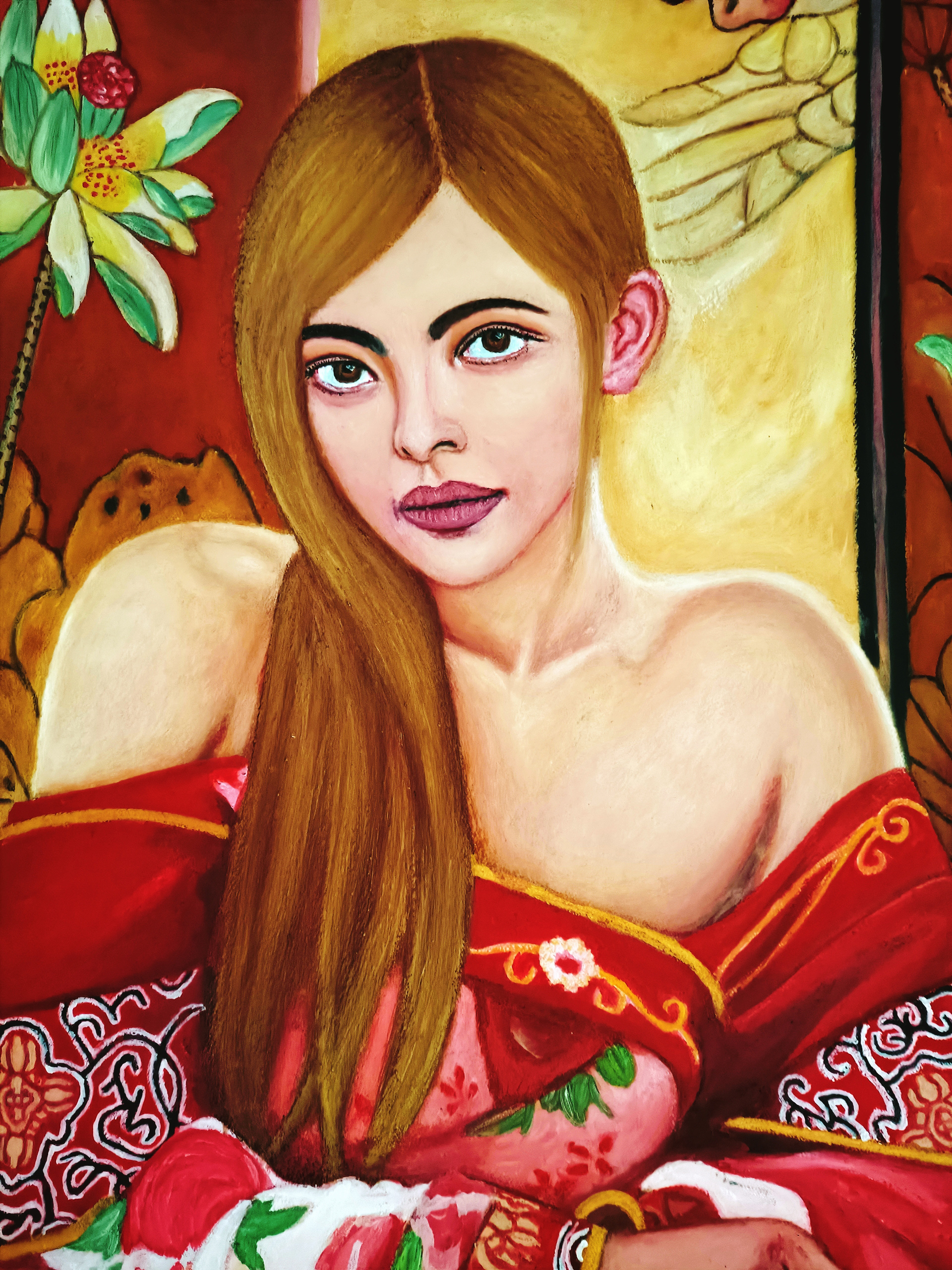 这是幅国画版的油画,这也是画家追随吴冠中先生这种西洋油画中国画化的精髓体现。画家追求人物肖像写实油画要展现出“血、肉、灵魂”,要画出“质感”。画家画写实油画,一般总是老老实实用最原始的传统方法,按照欧洲古典油画技法,先素描、打底色、上N次油画色,最后细节化、色彩化上N次油画色完成。当然,画家绘画创作过程中会遇到挑战,有时会采用自己在绘画实践中独特的技法去解决。