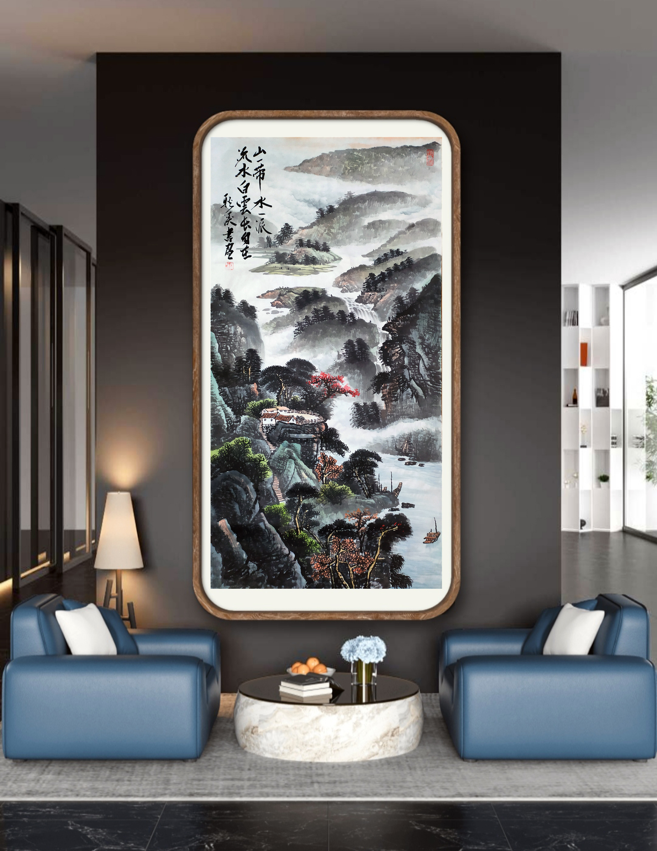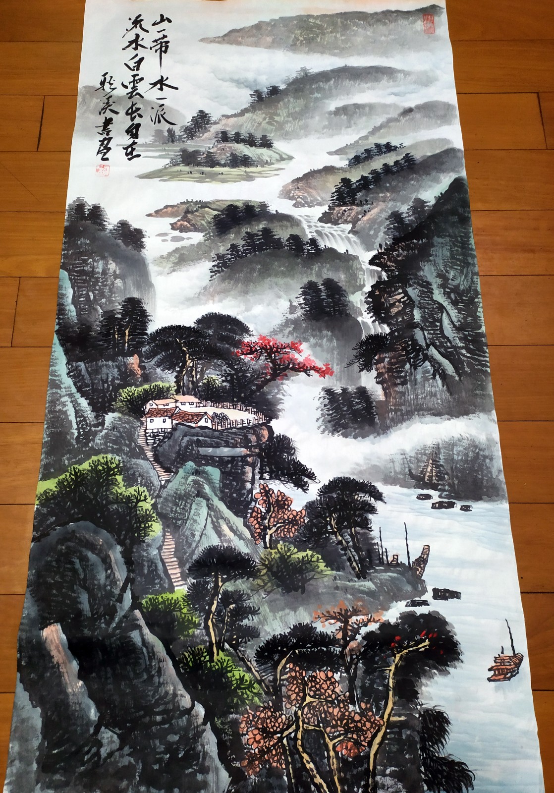 国画山水《山一带,水一派,流水白云长自在》138x68cm