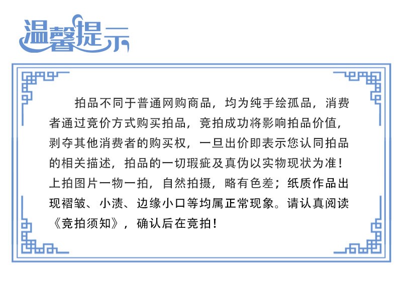 4.2 参与竞拍活动的商品由商家提供,并由商家进行配送及相应的售后服务。用户参与竞拍活动前应仔细查看竞拍活动页面对竞拍商品的信息、商品描述介绍。且知悉认可因摄影、显示等造成描述作品的色调等与原物有误差的,以原物为准。