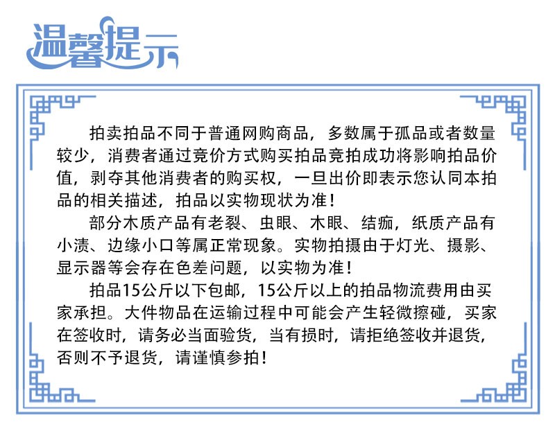 4.2 参与竞拍活动的商品由商家提供,并由商家进行配送及相应的售后服务。用户参与竞拍活动前应仔细查看竞拍活动页面对竞拍商品的信息、商品描述介绍。且知悉认可因摄影、显示等造成描述作品的色调等与原物有误差的,以原物为准。