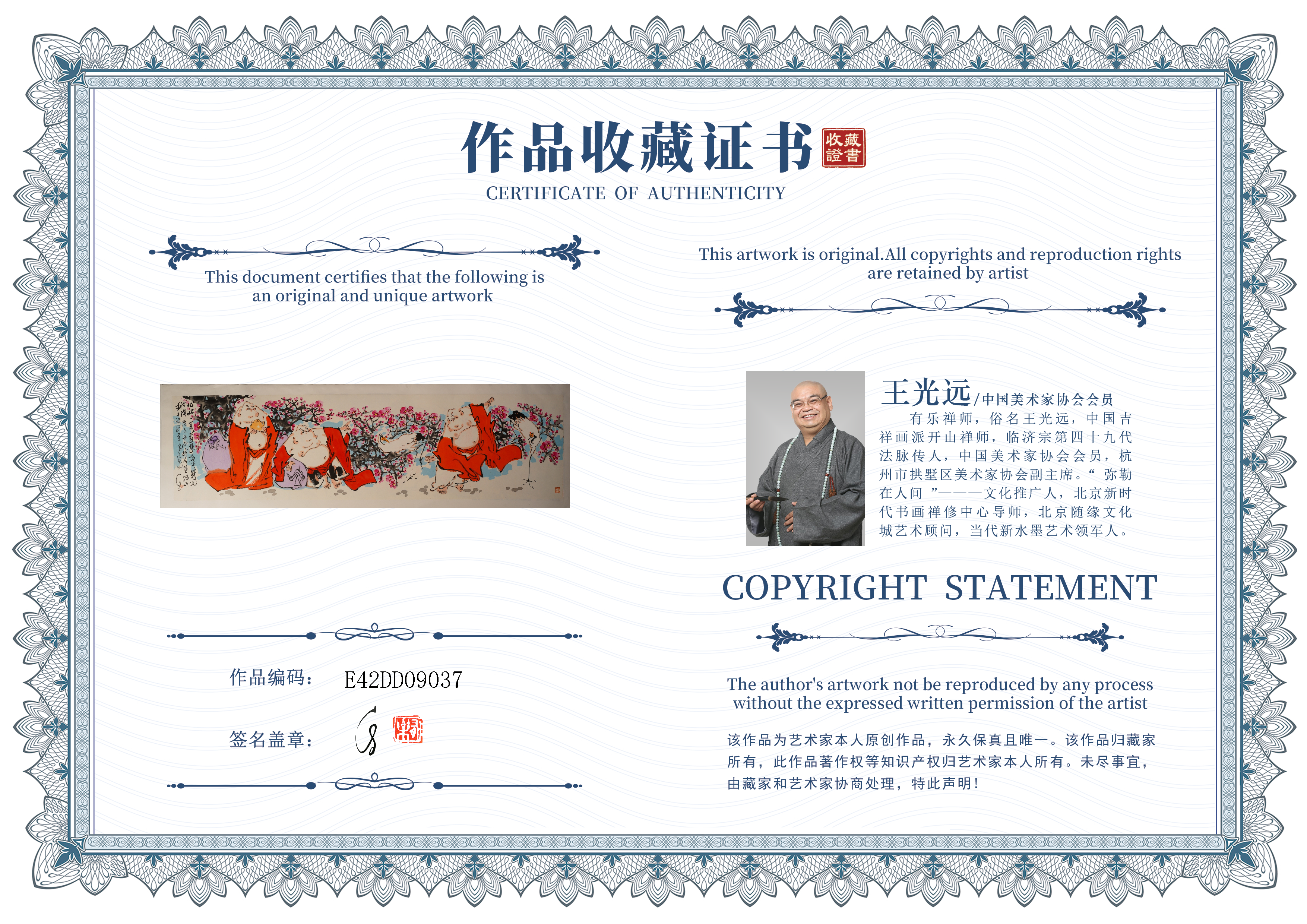 【作者简介】有乐禅师(炤鉴),俗名王光远,中国佛门吉祥画派开山禅师,中国美术家协会会员,北京一笔禅堂主持。自幼承家传习书画,研佛经,擅禅意吉祥画,尤精于红衣笑佛,弘扬佛光山星云大师一笔禅墨心法,以笔墨做佛事,被公认为画弥勒佛“国手”,在中国画坛上树起了一面画弥勒佛的旗帜。 作品多次入选文化部和中国美协举办的大展并获奖,其书画精品被国内外书画收藏家和美术馆广为收藏,传略收入《世界名人录》、《跨世纪著名书画艺术家经典》。 现供职北京中华清风书画家协会,从事书画创作和学术研究。