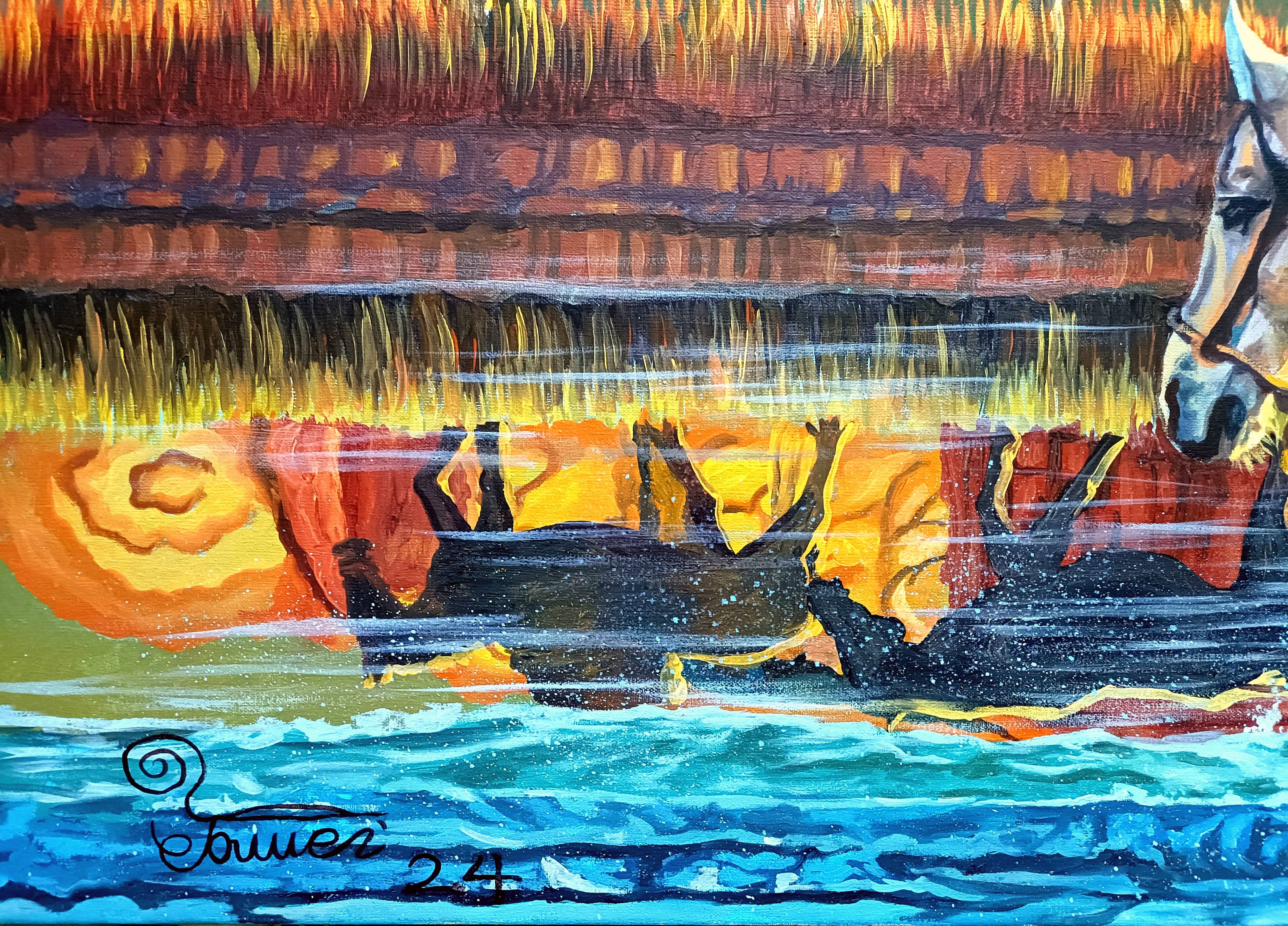 夕阳西下,在西部的草原上牛仔们和马儿悠闲地享受着温暖的阳光。两个牛仔在岸上骑马,另外一个牛仔骑马在水里行走,三个人好像在聊着今天有趣的收获,马儿们默默不语得走着,此刻他们都在享受这一刻的祥和!