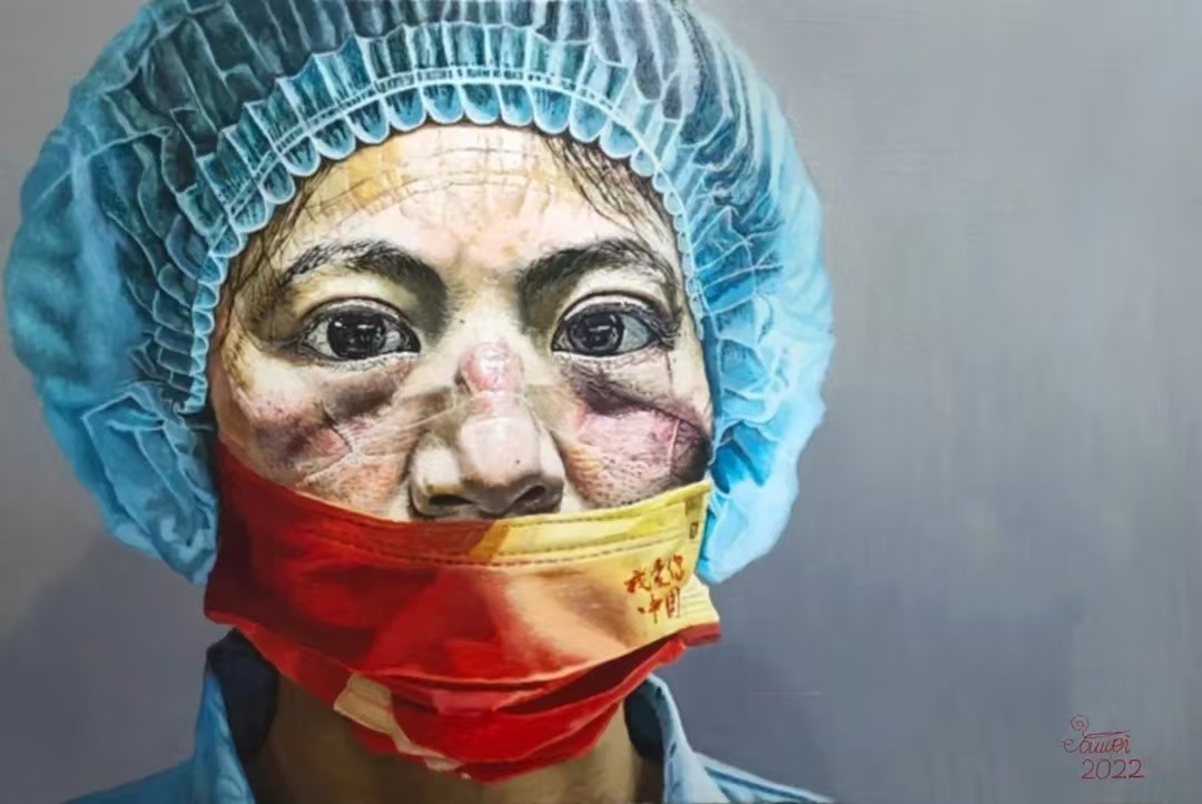 超写实油画《中国医生》是尤伟的代表作之一。作品记录的是一位刚刚工作完医务人员回到休息室即将脱下口罩息休的情形。我们能够看到她脸上的被长期用医疗设备和汗渍侵蚀的皮肤,还有她疲惫的眼神表现了这位在一线工作的防疫医务人员的疲惫,但是眼神里面还带有坚定的感觉,这是一种大无畏的精神体现。