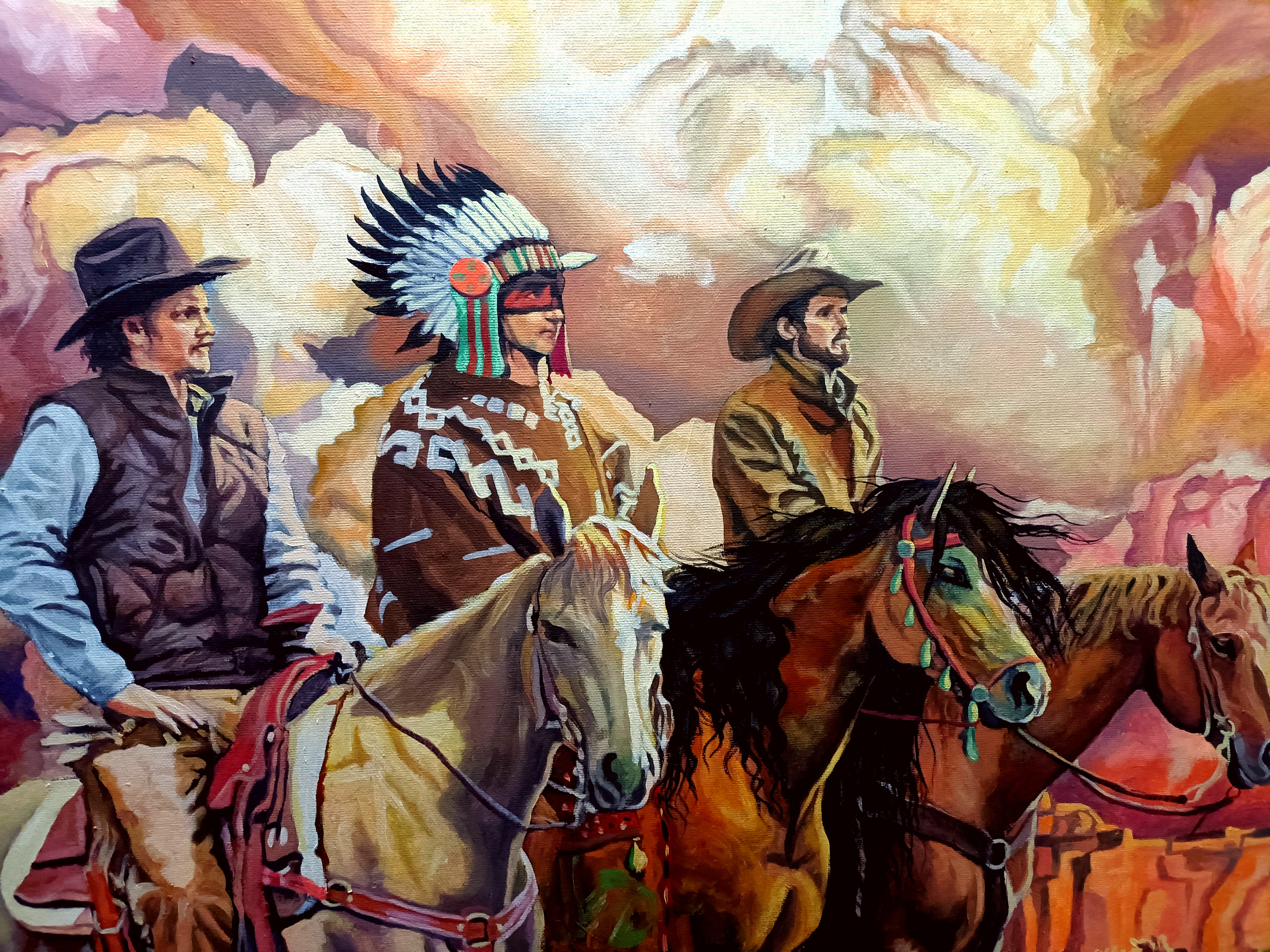 这幅作品我利用表现写实的方法来表达自己的风格,内心深处的对自由和野性的呼唤。我画的是最后的莫西干人这里隐喻我是独一无二的创作者,孤独长伴随左右,我同时也希望遇到俩位挚友与我同行,抛去一切芥蒂共同以游侠的生活方式探索一切美好的未知!绘画方法千篇一律,可尝试以另一种方式来表现才是我真正的艺术归宿!