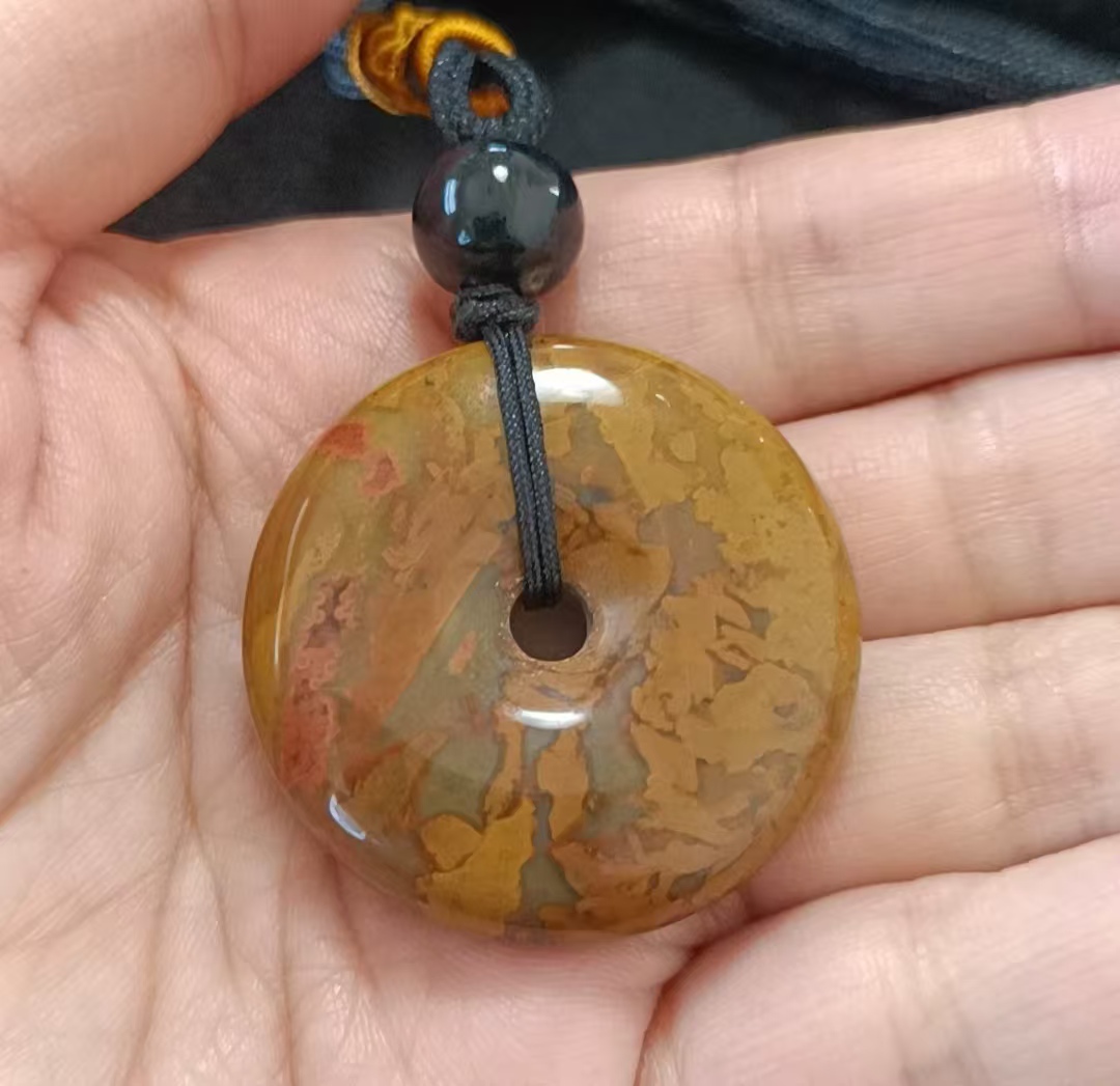 宣化战国红鸡油黄平安扣有证书。品相看图,所见即所得,图片都拍出来了。颜色非常好看,尺寸也足够大。大约34×10,加绳子23克。