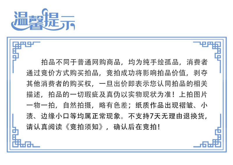 4.2 参与竞拍活动的商品由商家提供,并由商家进行配送及相应的售后服务。用户参与竞拍活动前应仔细查看竞拍活动页面对竞拍商品的信息、商品描述介绍。且知悉认可因摄影、显示等造成描述作品的色调等与原物有误差的,以原物为准。