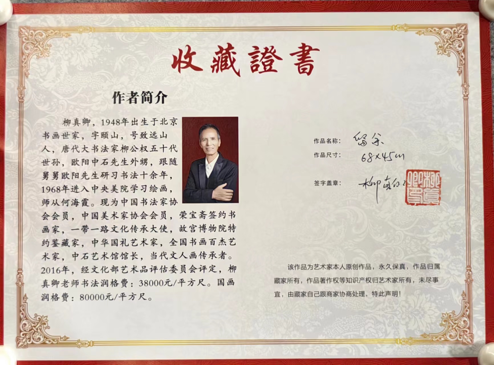 2016年,经文化部艺术品评估委员会评定,柳真卿老师书法润格费:38000元/平方尺;国画润格费:80000元/平方尺。