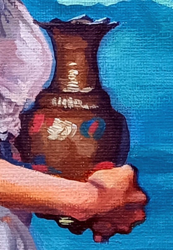 此作品是为了致敬大师安格尔而创作,依旧运用了我自己的风格来表现,只不过这次是大面积的冷色调。此作品没有画水但叫做泉是为了表现东方人的内敛,我们都不是把东西像西方那样放在明面上一目了然而是蕴藏在里,让欣赏者用东方人的角度把泉水完全收敛到水瓶里面,它既是哲学,又是中国文化的藏拙,苍劲中的优雅,温情里的疏离!表现写实的手法我开始结合东方文化中的韵律把它极致的表现出来!
