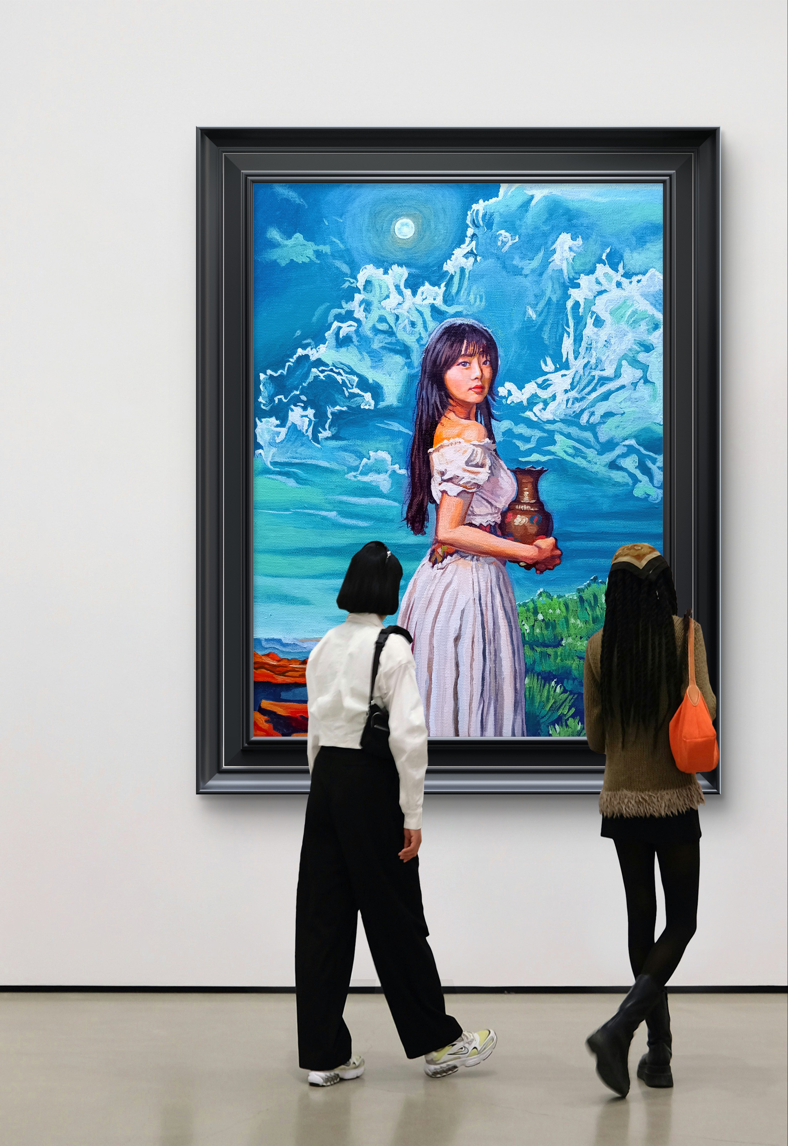 此作品是为了致敬大师安格尔而创作,依旧运用了我自己的风格来表现,只不过这次是大面积的冷色调。此作品没有画水但叫做泉是为了表现东方人的内敛,我们都不是把东西像西方那样放在明面上一目了然而是蕴藏在里,让欣赏者用东方人的角度把泉水完全收敛到水瓶里面,它既是哲学,又是中国文化的藏拙,苍劲中的优雅,温情里的疏离!表现写实的手法我开始结合东方文化中的韵律把它极致的表现出来!