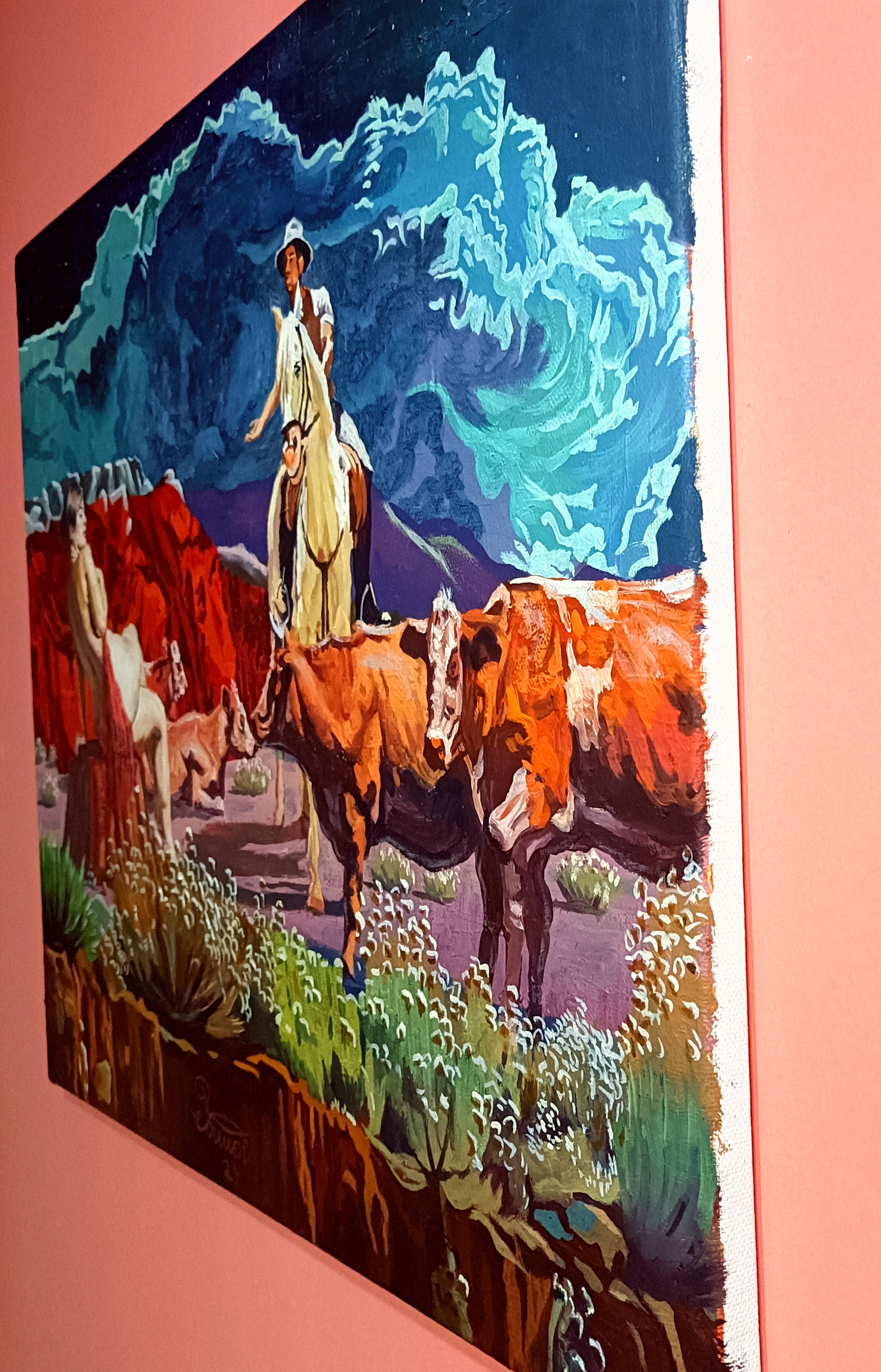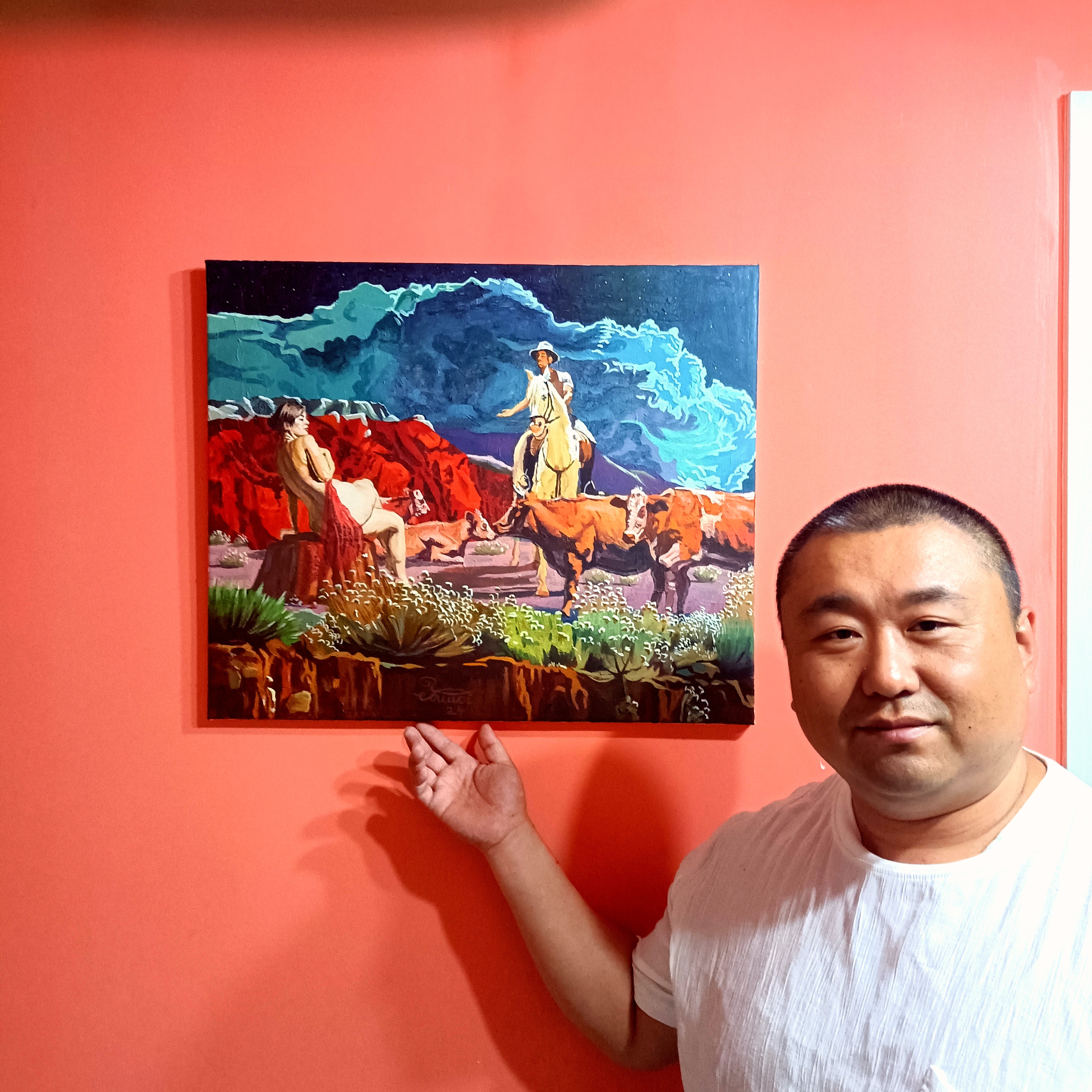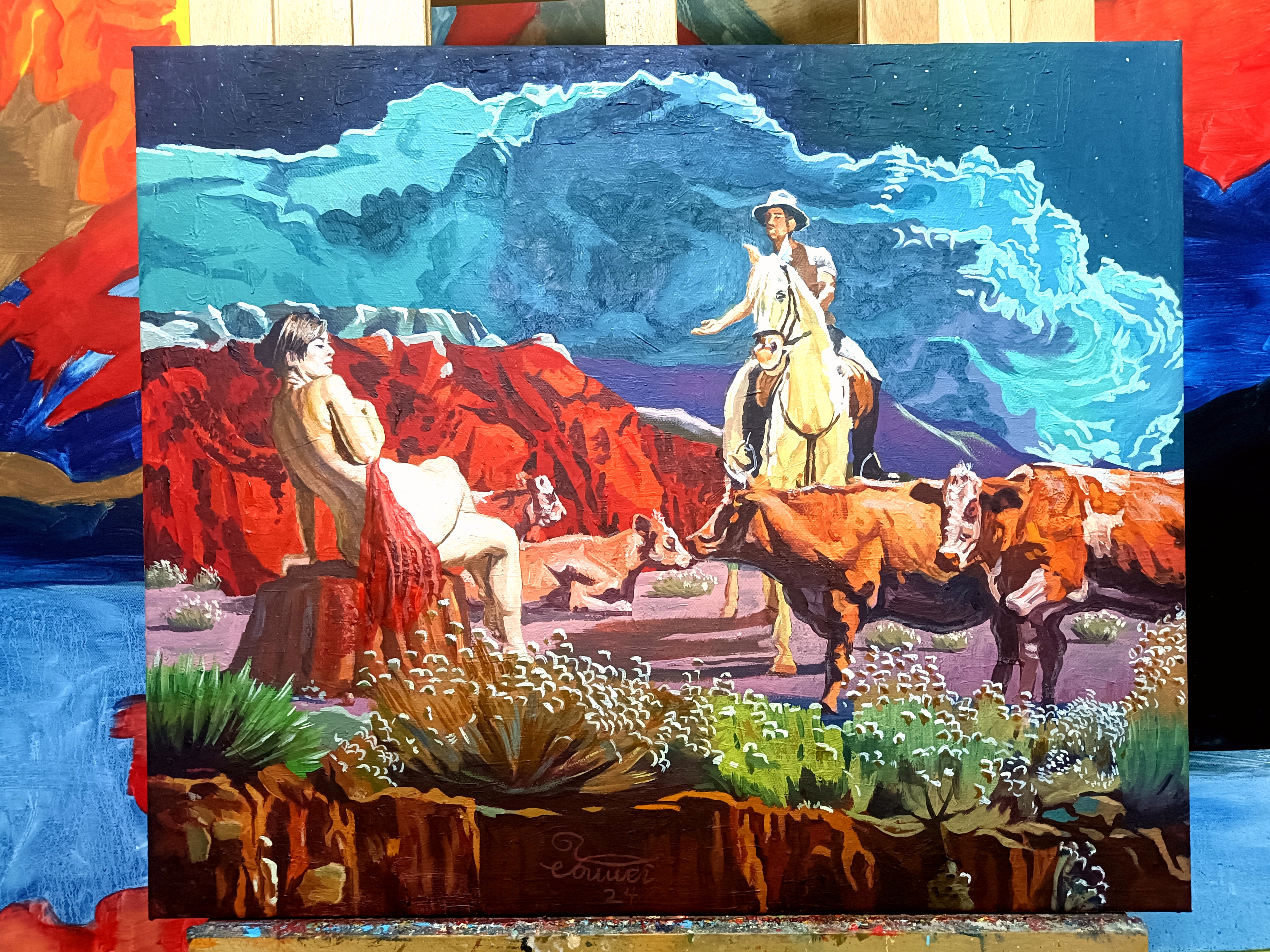 《偷吃禁果与救赎》这幅作品是根据旧约圣经中伊甸园里的故事改编的,最近读了木心先生的《文学回忆录》对西方文学有了更加深入的了解,在感受到旧约圣经中的故事觉得好奇而又新颖,我就想我是否可以以我的方式创造出伊甸园偷吃禁果的场景。这里要说明一点,原来创作的是裸女但是怕过不了审,所以加了块红丝织成的遮羞布,夏娃在偷吃禁果,而神突然出现制止了她,地上掉落的苹果,神幻化成一位骑着白马的牛仔,她用红布遮羞而神不忍看到她死但又犯下了不可饶恕的罪,慈悲的神决定把她逐出乐园,放她一条生路!
