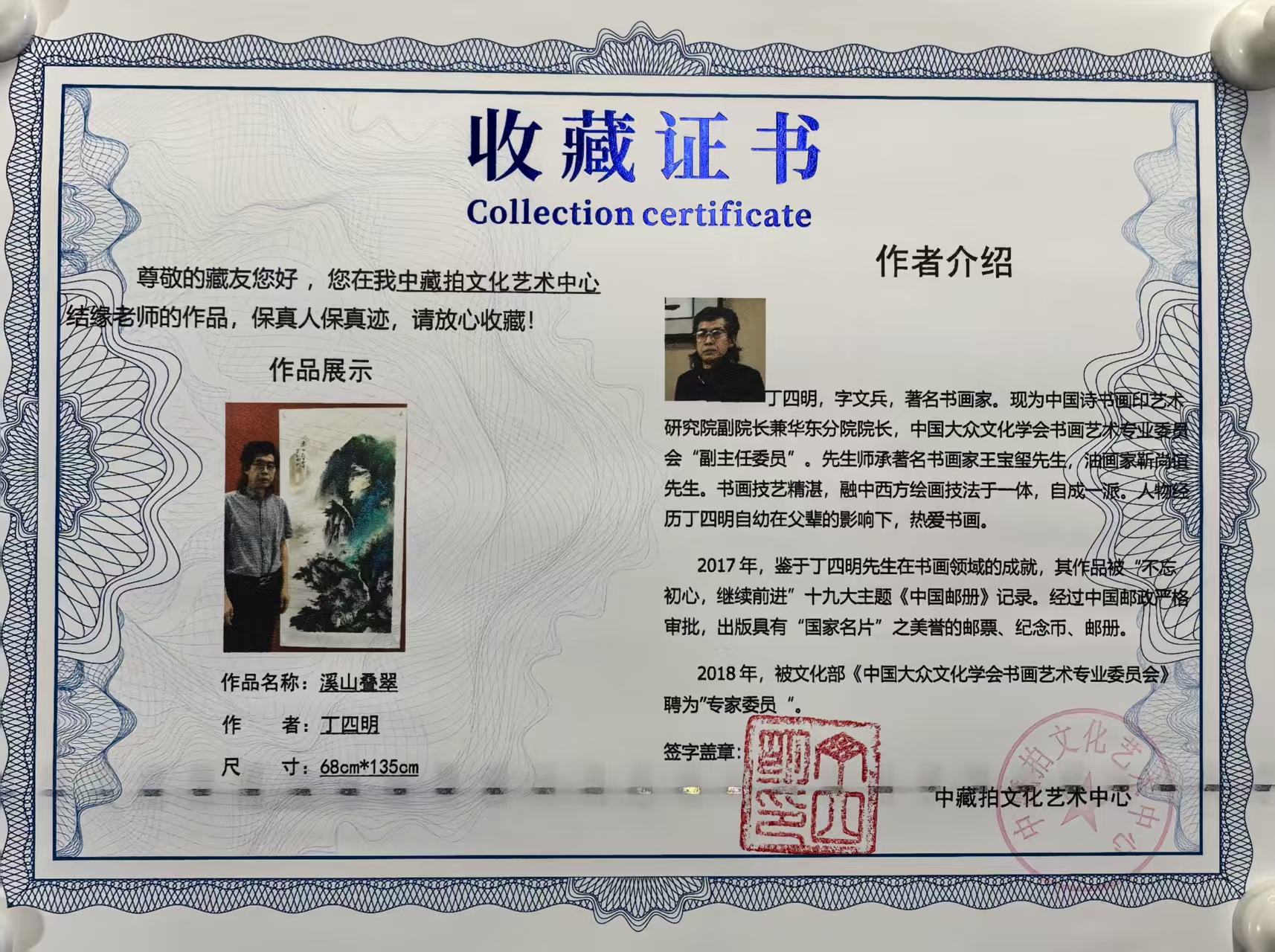2019年国际收藏家协会估价丁四明老师国画及油画每平尺2500美元(折合人民币17000元)。