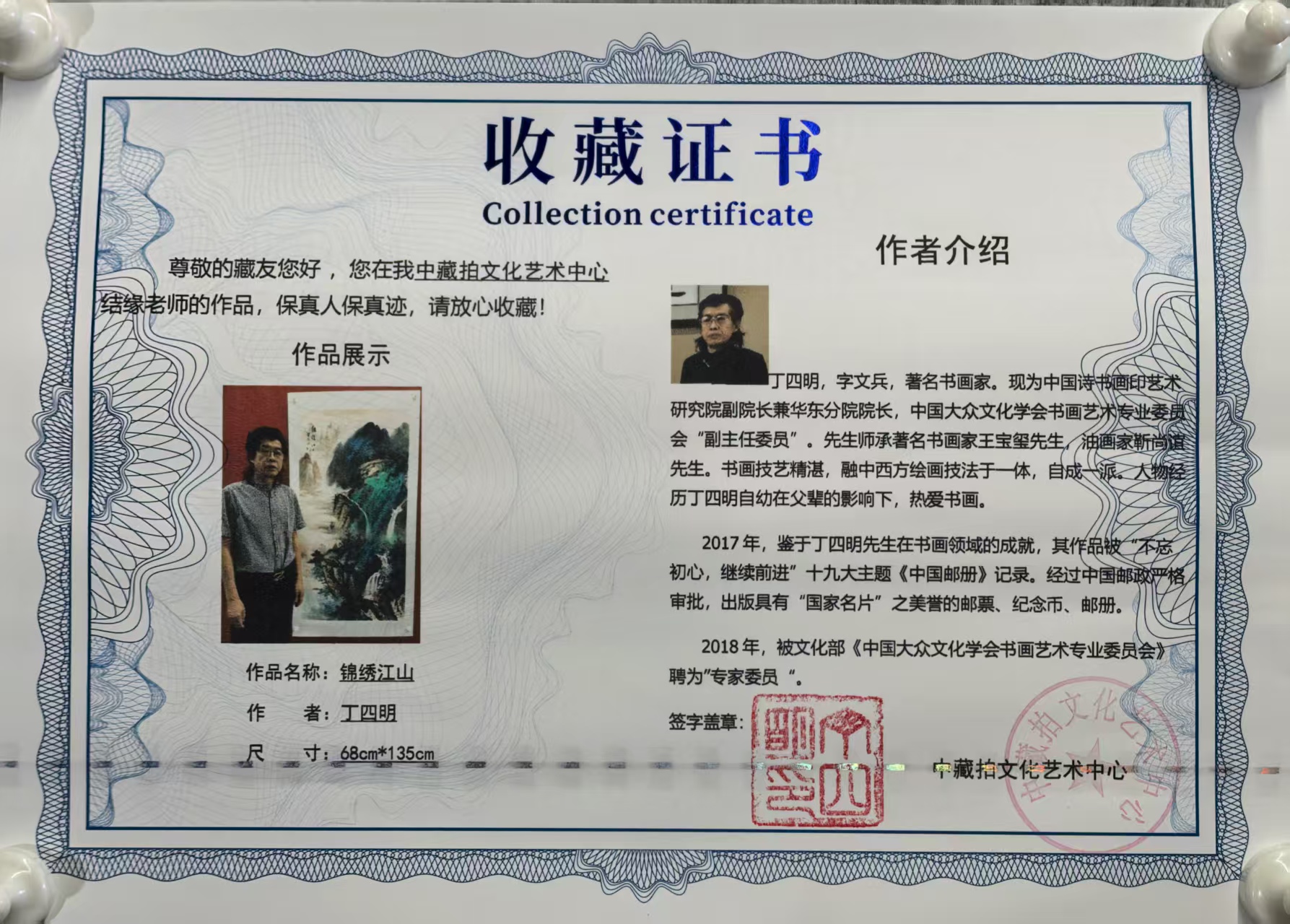 2019年国际收藏家协会估价丁四明老师国画及油画每平尺2500美元(折合人民币17000元)。