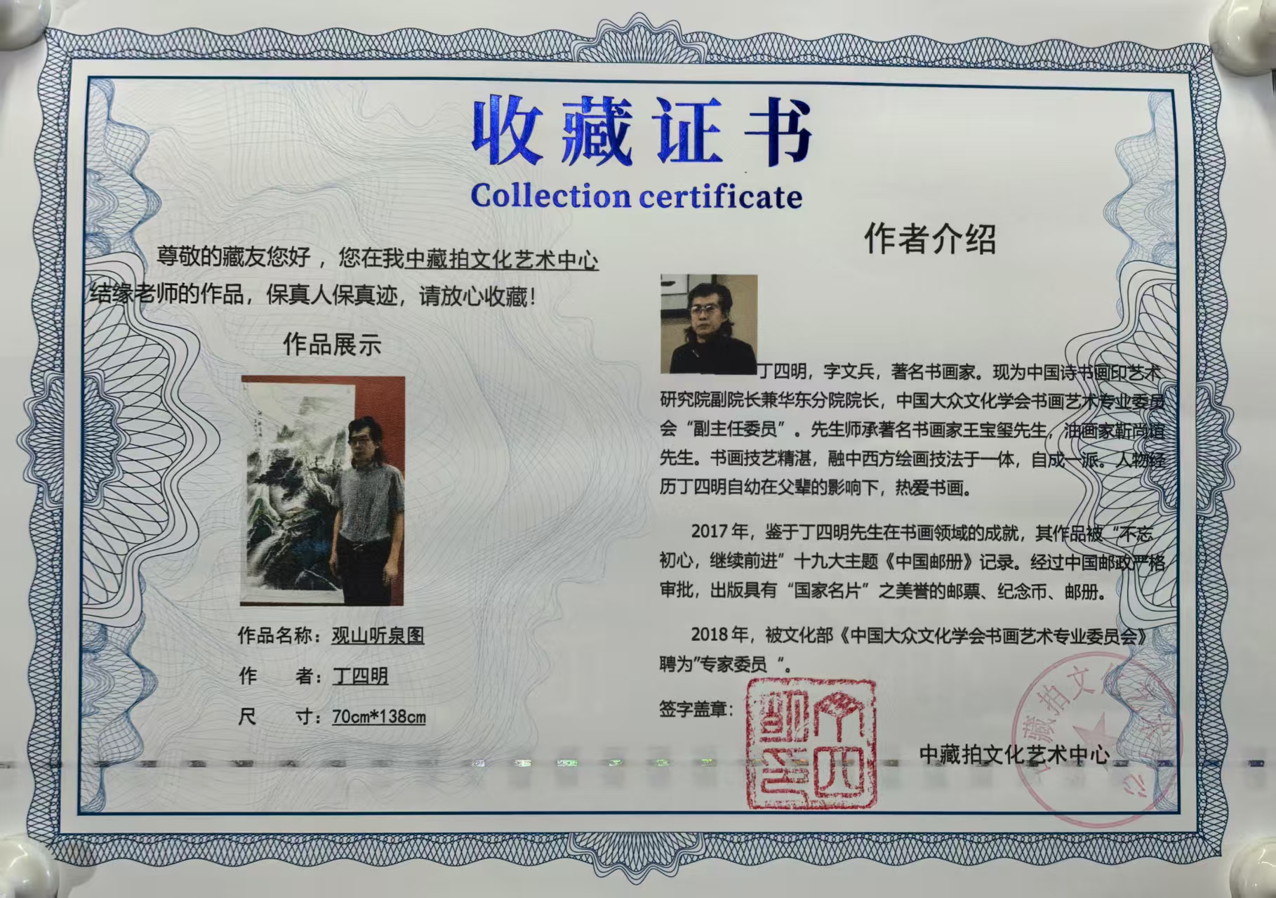 2019年国际收藏家协会估价丁四明老师国画及油画每平尺2500美元(折合人民币17000元)。