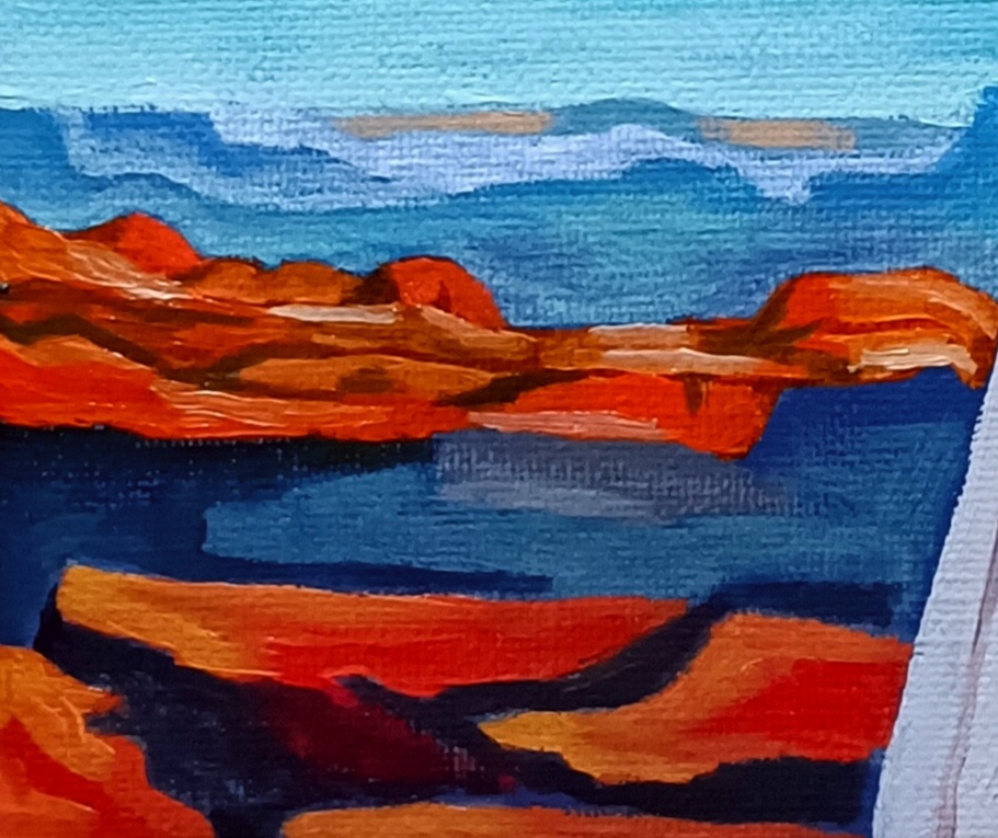 画中,一位身着白色连衣裙的女子站在辽阔的自然景色之间。她手持一个陶罐,仿佛在静静地享受这片无垠的宁静天地。湛蓝的天空中,云朵如诗般飘荡,月亮悬挂高空,增添了几分神秘与柔美。地平线上,绿草如毯,红色山岩与女子身影遥相呼应,构成了一幅和谐的画面。整幅作品给人一种沉静与稳定的感官体验,仿佛时间在这一刻凝固,世界只剩下自然与人的相互交织。