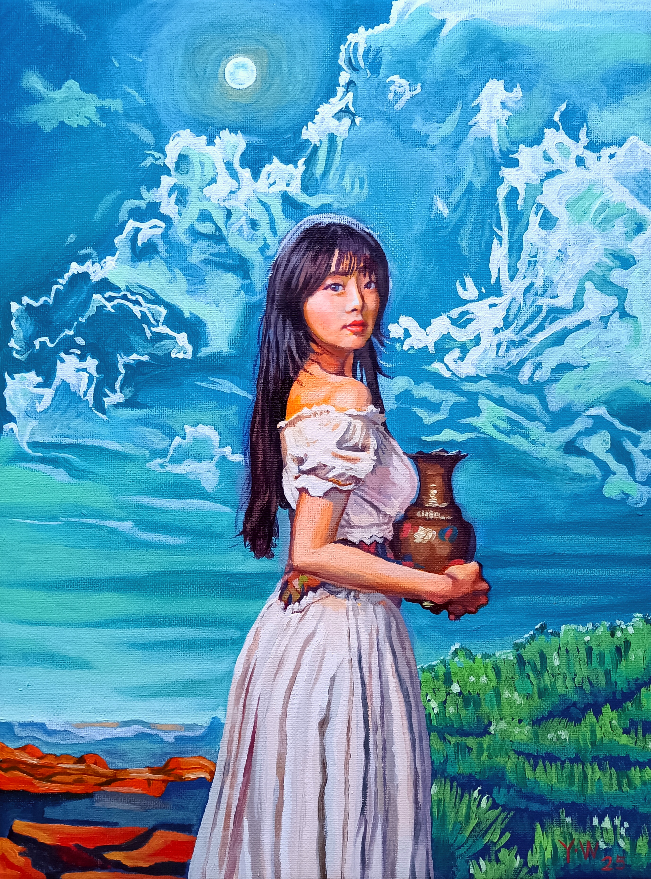 画中,一位身着白色连衣裙的女子站在辽阔的自然景色之间。她手持一个陶罐,仿佛在静静地享受这片无垠的宁静天地。湛蓝的天空中,云朵如诗般飘荡,月亮悬挂高空,增添了几分神秘与柔美。地平线上,绿草如毯,红色山岩与女子身影遥相呼应,构成了一幅和谐的画面。整幅作品给人一种沉静与稳定的感官体验,仿佛时间在这一刻凝固,世界只剩下自然与人的相互交织。