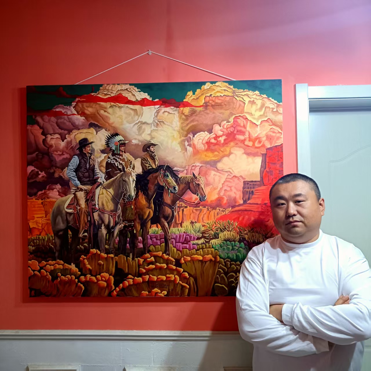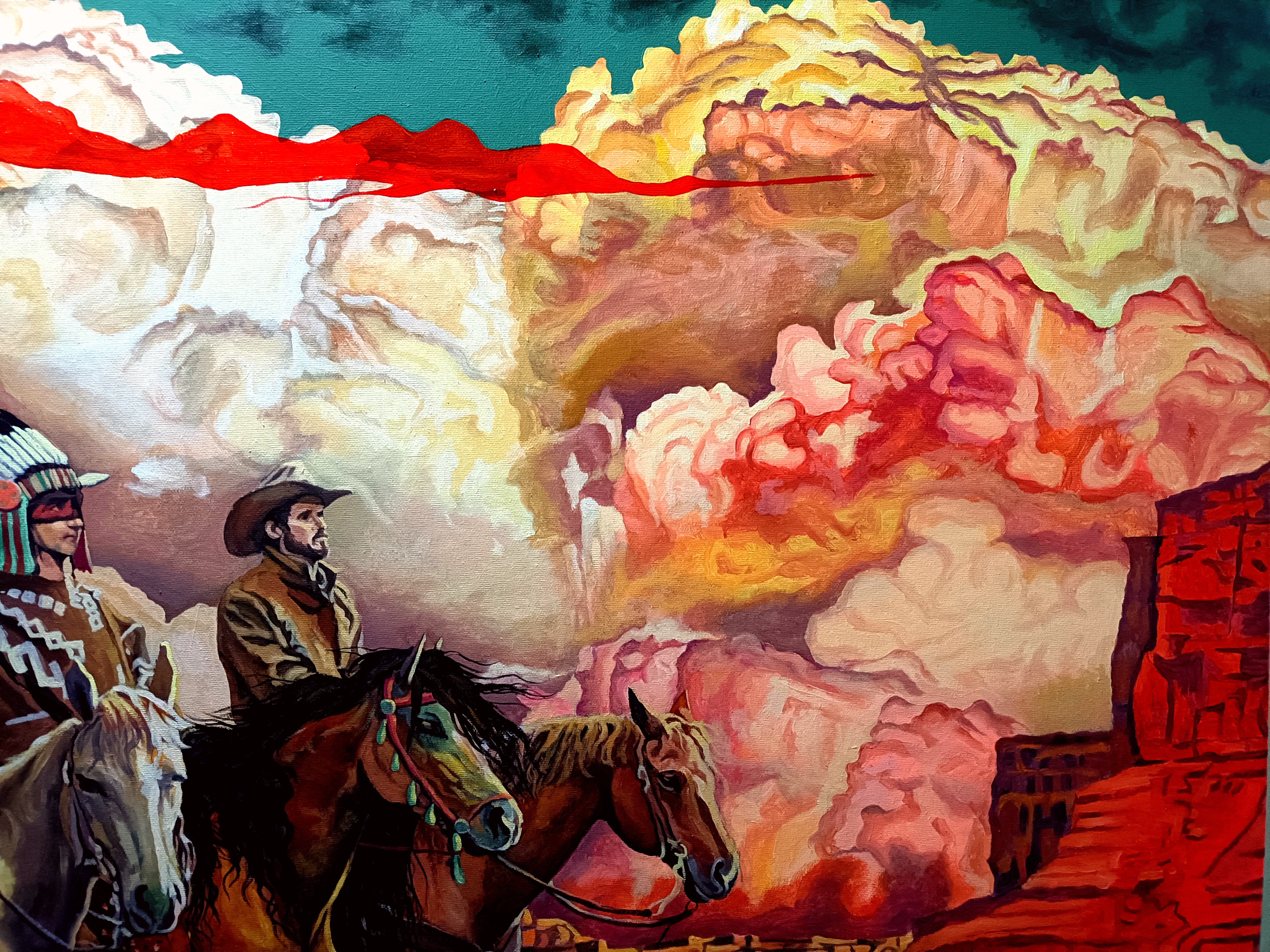 绘画作品展现了三位骑马的壮士,他们分别身穿牛仔装和原住民传统服饰,驻足于广袤的西部荒野。画面色彩绚丽,天空流动的云彩仿佛在诉说着苍穹下的古老故事。远处峡谷若隐若现,似乎在引领这勇敢的骑士们前往未曾探索的领域。画中的每一个元素都传达了一种悠远的历史感和无尽的冒险精神,呼唤着观者对西部边疆传奇的无限遐想。