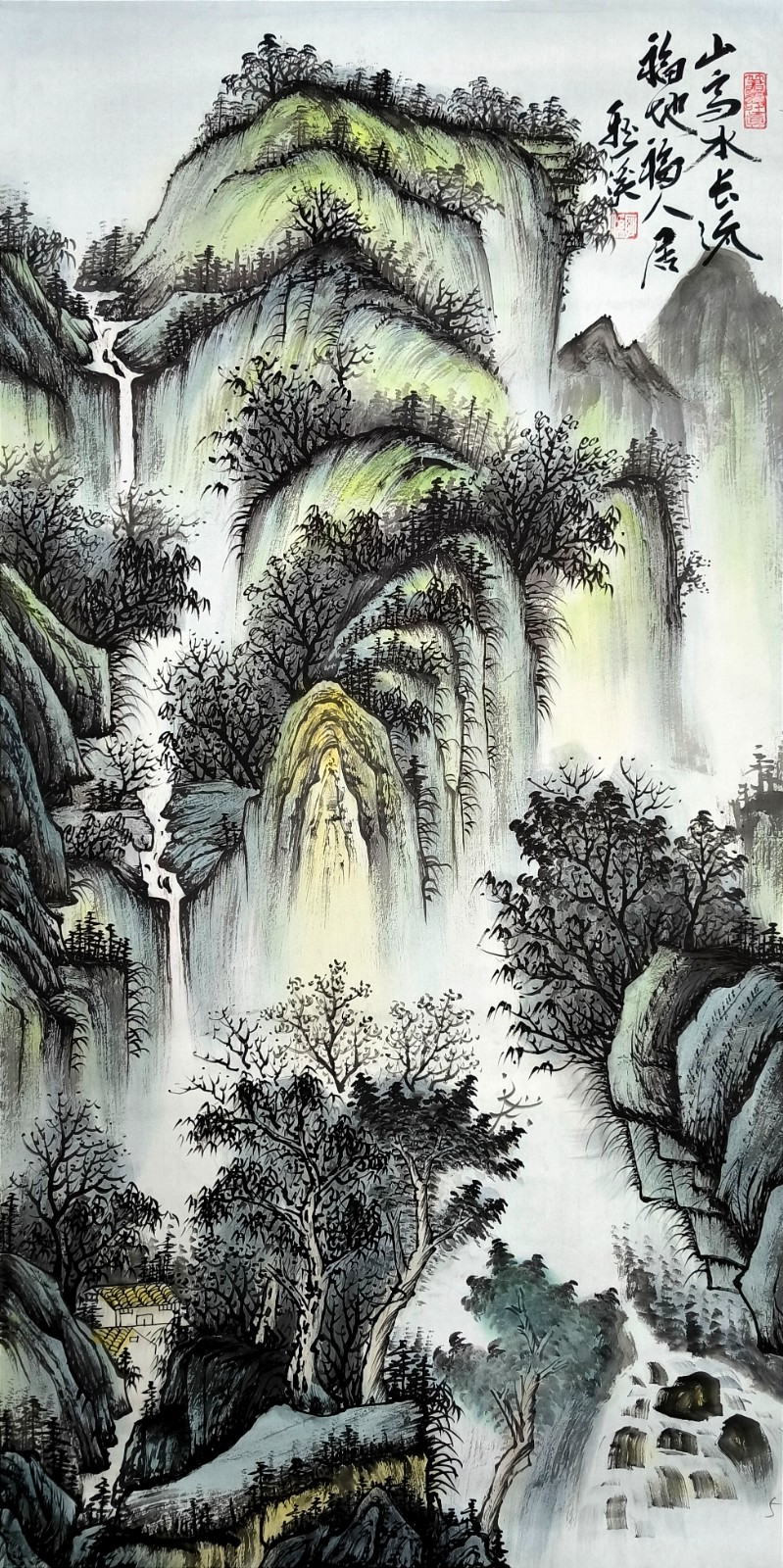 山水画《山高水长流,福地福人居》138x68cm+对联138x34cmx2《登高望远天地阔,纵横捭阖自从容》