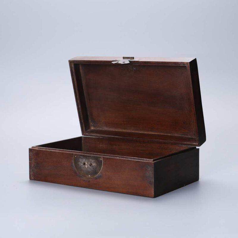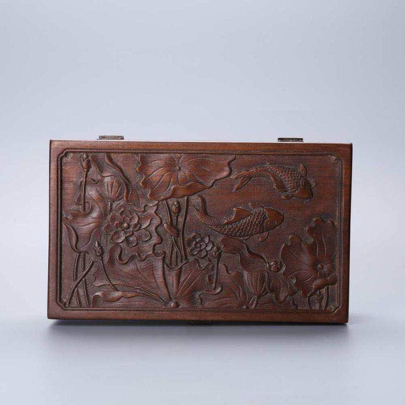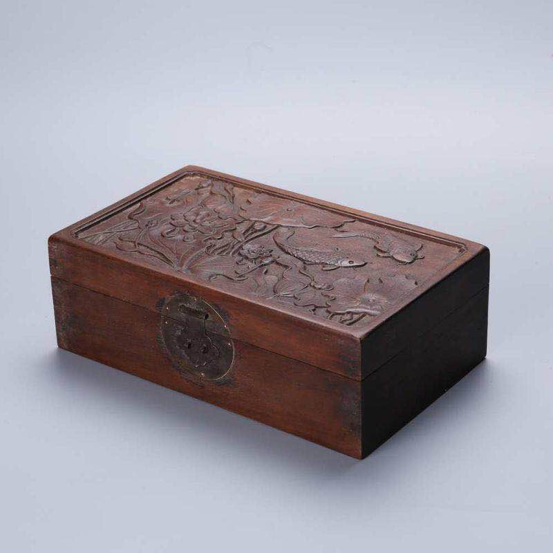 此件文房盒为花梨木材质,整体呈长方形,中间用铜扣连接,铜件完好。盒盖表面浮雕莲池游鱼的纹饰:莲叶田田,莲花或含苞待放,或迎风盛开,两条鲤鱼游弋嬉戏期间,雕刻精细,生动自然。莲花与鲤鱼组成“连年有余”的美好寓意,寄托了人们的美好生活愿望。整体上品相较好,包浆灿然,文房盒的路份较高,非常难得。