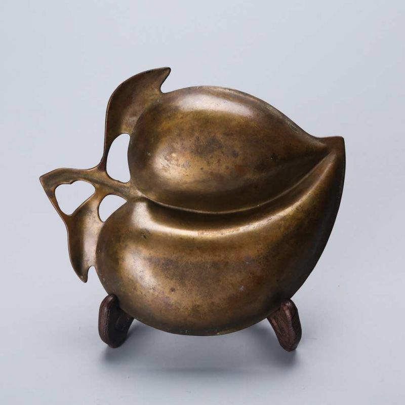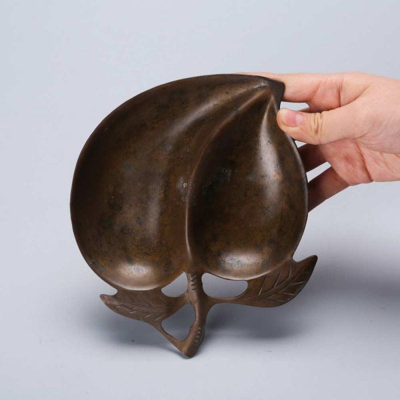 笔舔是文房用具,属于小件,是文人写字时候用来顺笔锋的器物,档次较高。此件铜笔舔呈剖开的寿桃形,线条流畅有力,包浆厚实,较为难得。