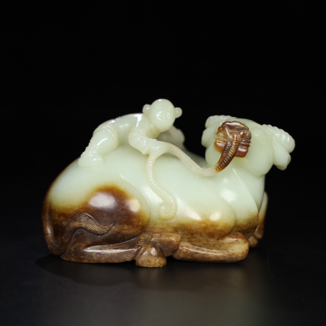 和田玉童子戏牛,玉质细腻油润,雕工精湛流畅,视觉饱满圆润,包浆老道,细节如图所示,尺寸高 8厘米,长 12.8厘米,宽 6.9厘米,重 898克!