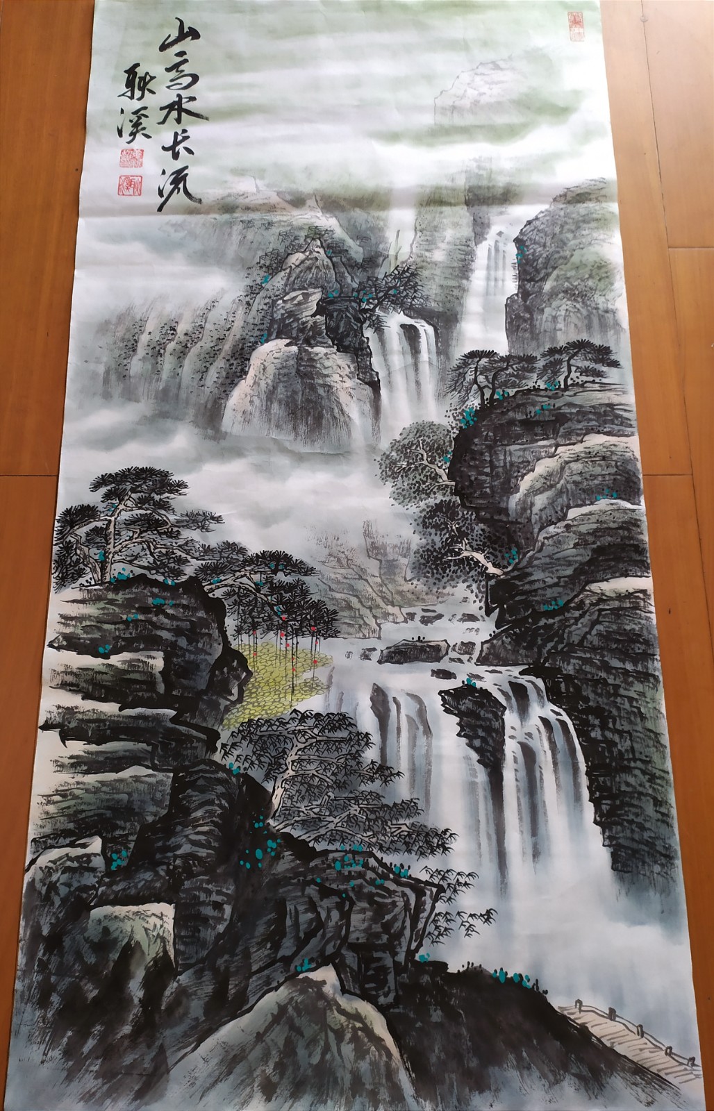2023年作品,国画410《山高水长流》130x68cm+N12书法对联《人生哪能多如意,万事只求半称心》138x34cmx2