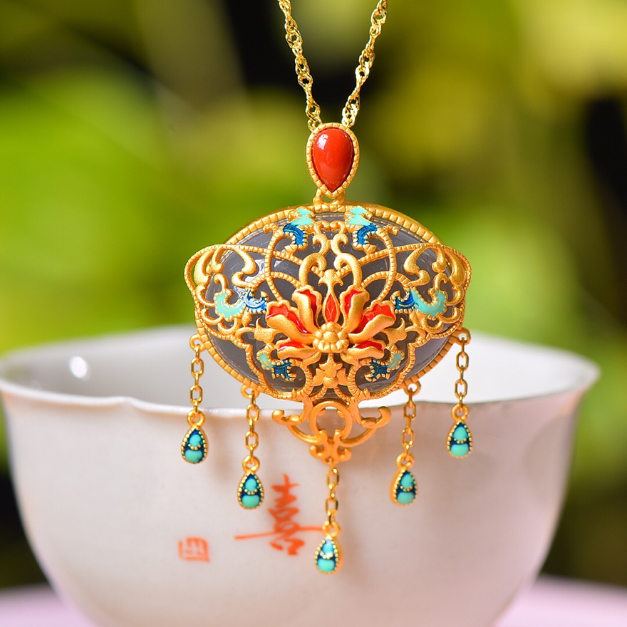 925银镶和田玉青海玉烟紫珐琅吊坠