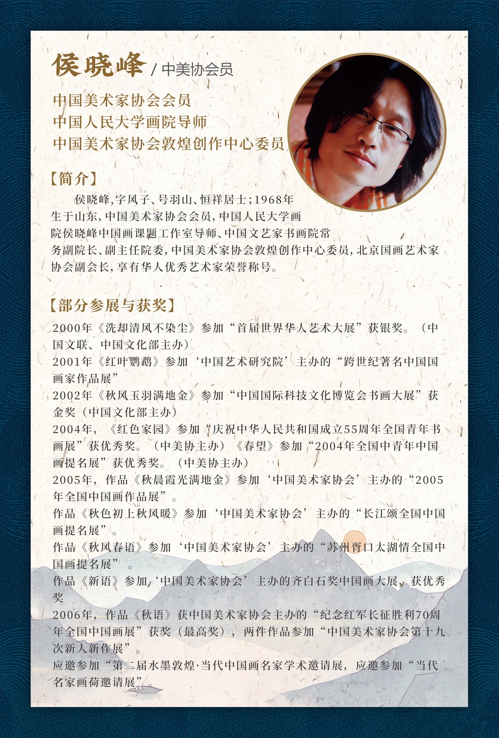 【作者简介】侯晓峰,男,字风子,号羽山、恒祥居士;1968年生于山东。中国美术家协会会员,中国文艺家书画院常务副院长、副主任院委,中国美术家协会敦煌创作中心委员,北京国画艺术家协会副会长、一级美术师,享有华人优秀艺术家荣誉称号。曾就读于中国艺术研究院研究生院硕士研究生李魁正工作室。