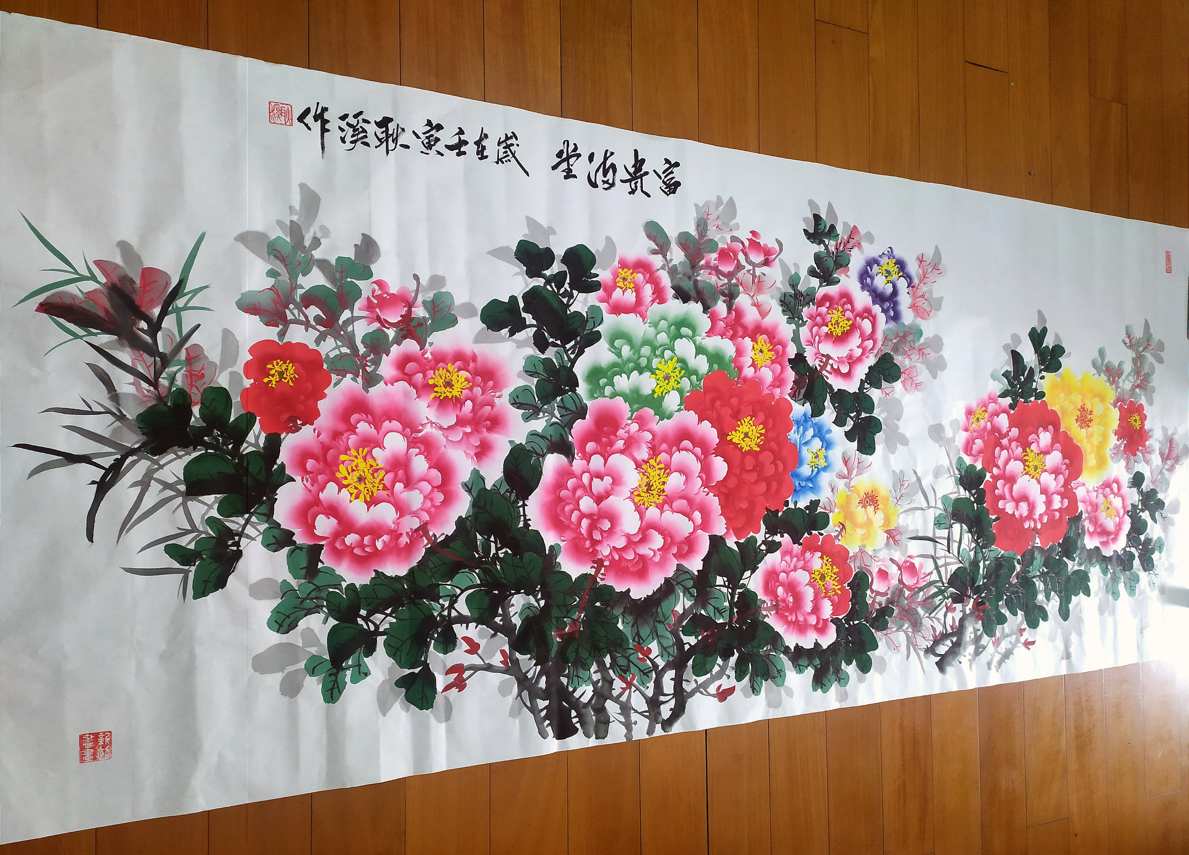 2023年作品,国画240x96cm牡丹:富贵满堂