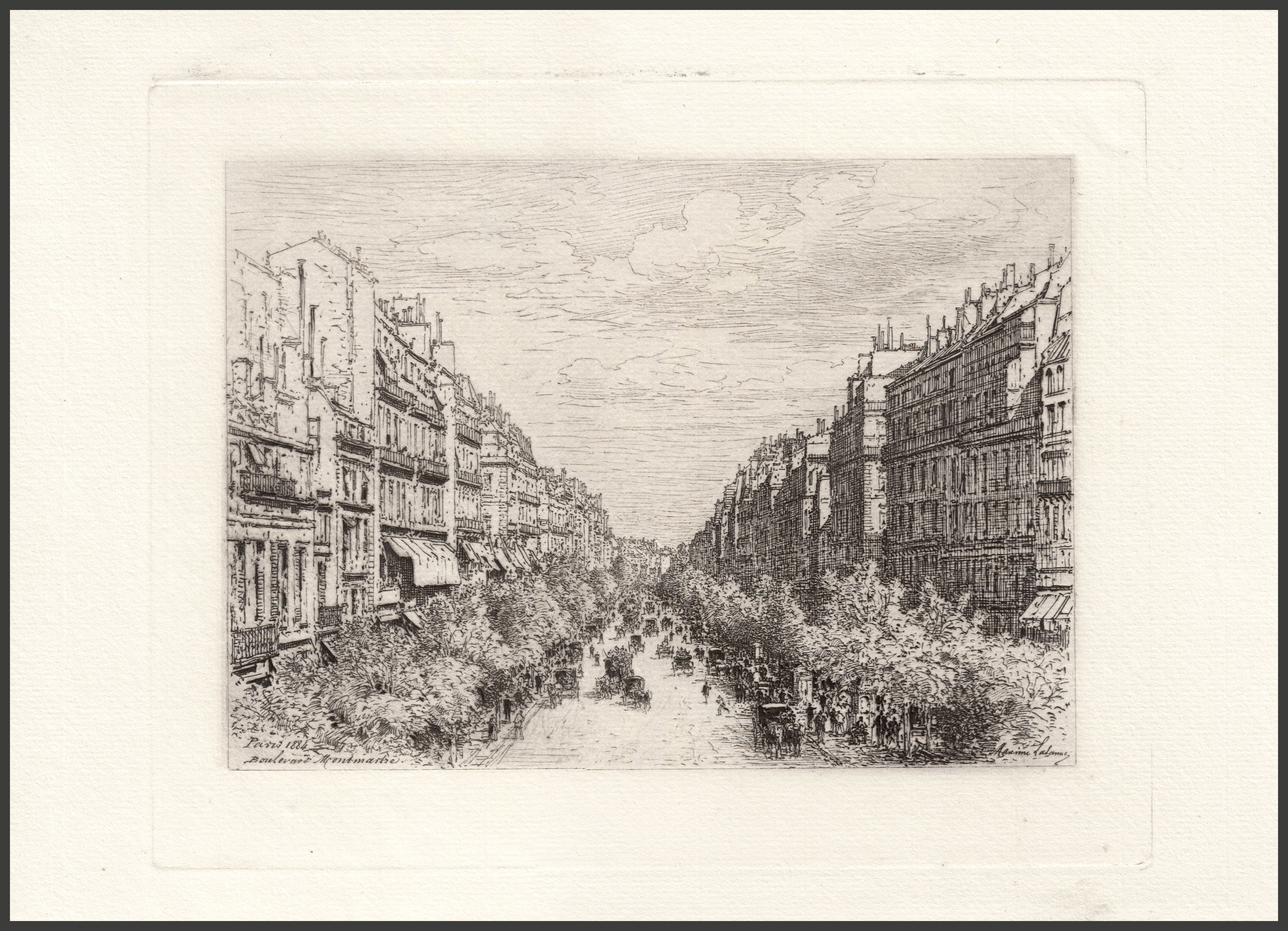 这是一件大师作品,来自蚀刻复兴运动时期法国的代表人物、领军者、导师马克西姆·拉兰内之手。“蚀刻复兴运动”是一个群雄并起的时代,包括一众印象派画家也下场参与角逐,但其中混杂着大量技法上不成熟、艺术上尚且只能的版画,收藏的时候需要鉴赏力,而《巴黎蒙马特的林荫大道》无疑是其中的精品、力作,一望而知的大师手笔。